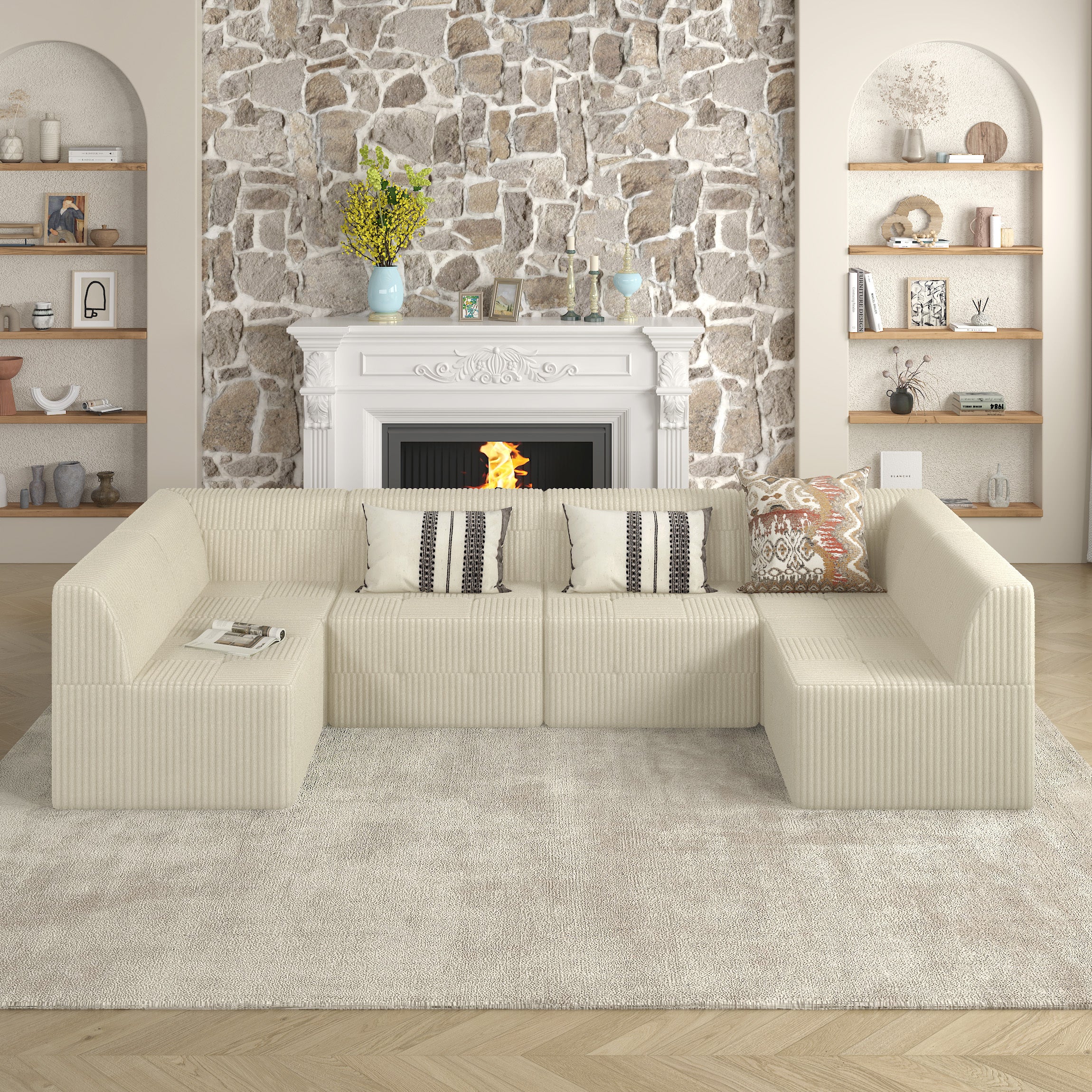 Deep Seat U-Shape Sectional Sofa, Cream Corduroy
