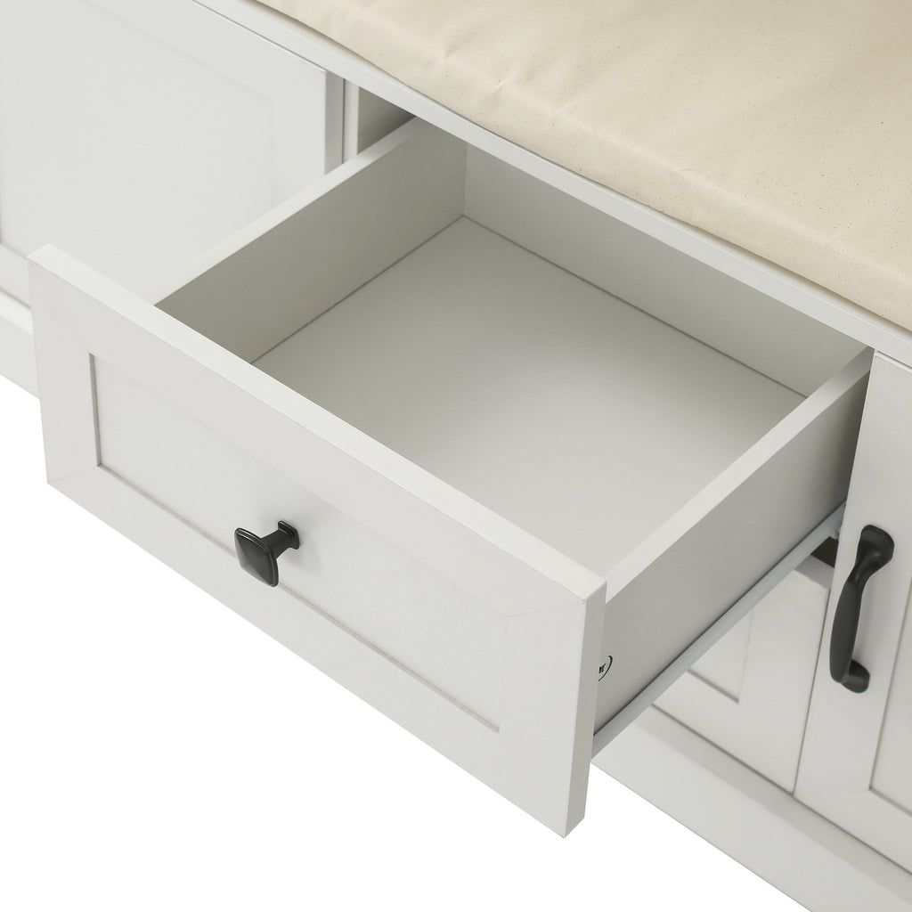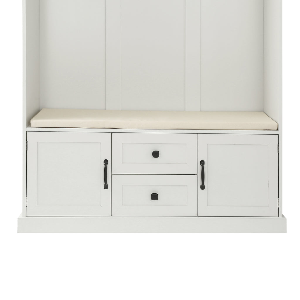 Classic details give our Storage Locker a traditional look, but clean lines and a modern finish bring this hall tree into the now. Generous, sweeping crown molding accents the top of the case; 3-open cubbies lie below it, awaiting your display items, books, accessories and more. The open area beneath the cubbies features elegant beaded-board paneling, 3-double hooks for coats and bags, and a comfortable seat with cushion. The grand finale of this mudroom storage piece, 2-drawers and 2-doors that allow you to store away even more necessitie.