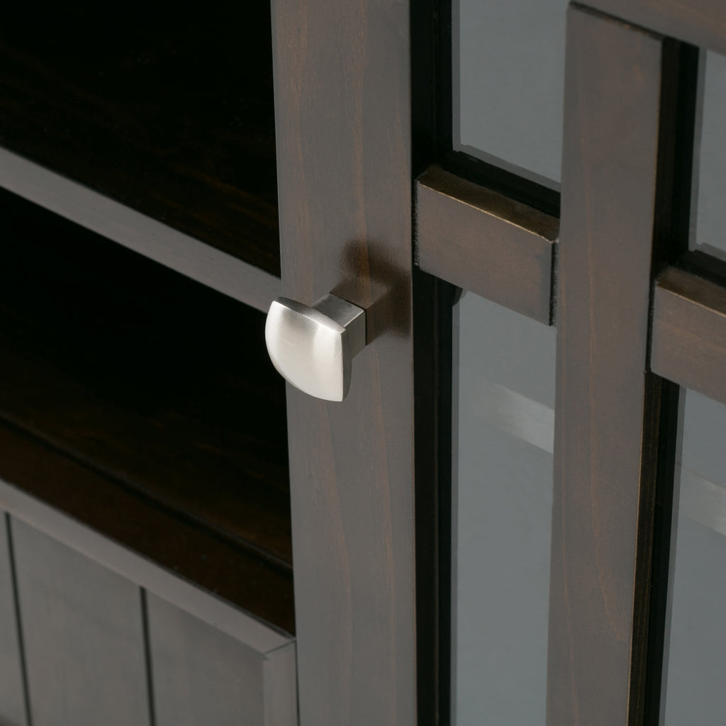 - Transitional design includes molded table top, beaded drawer fronts and sides,lightly tapered legs, tempered glass doors with cross hatch style mullions and brushed nickel hardware