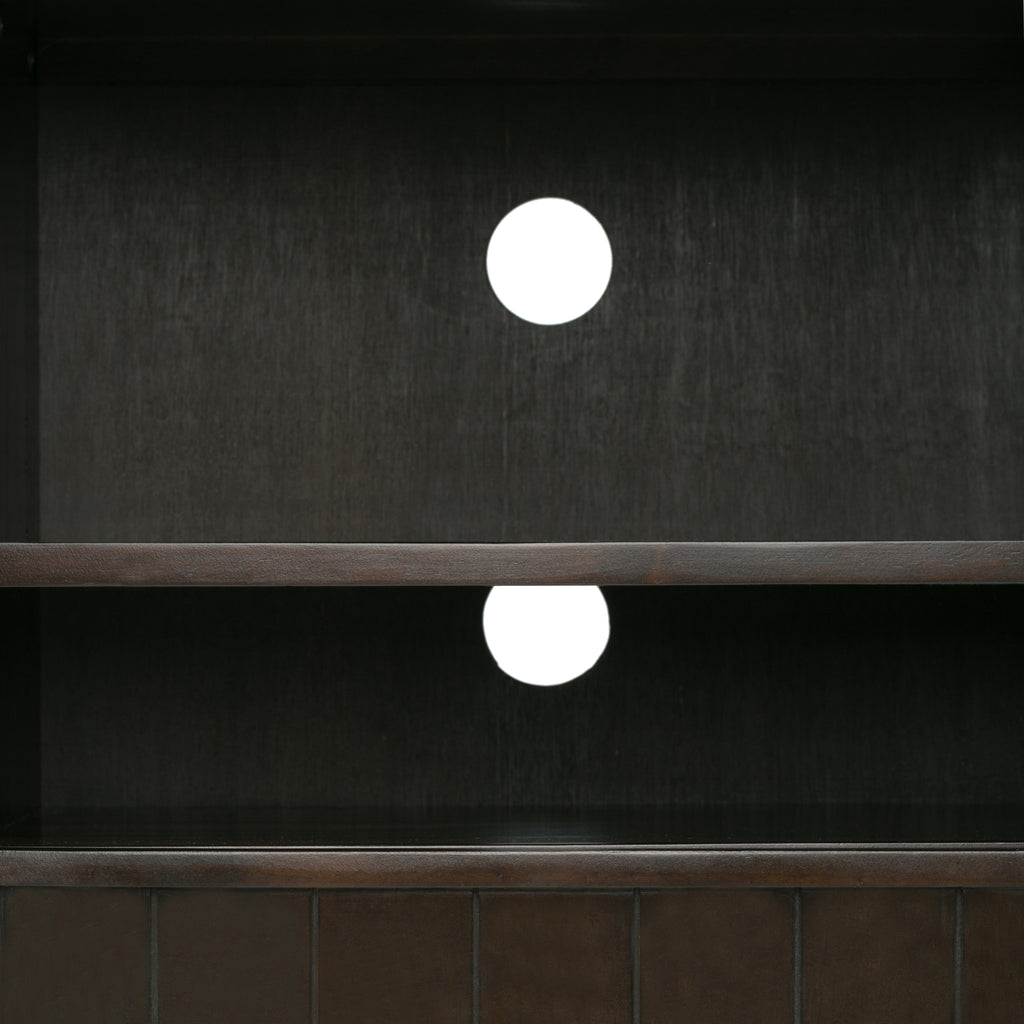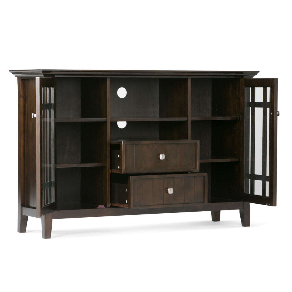 - Features two (2) central drawers with metal glides, open center area with adjustable shelf and two (2) side doors that open to large storage spaces with two (2) shelves each