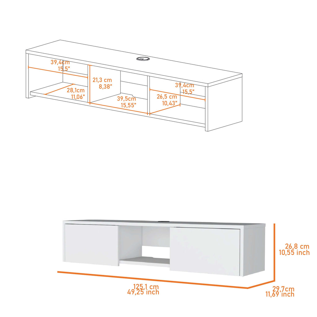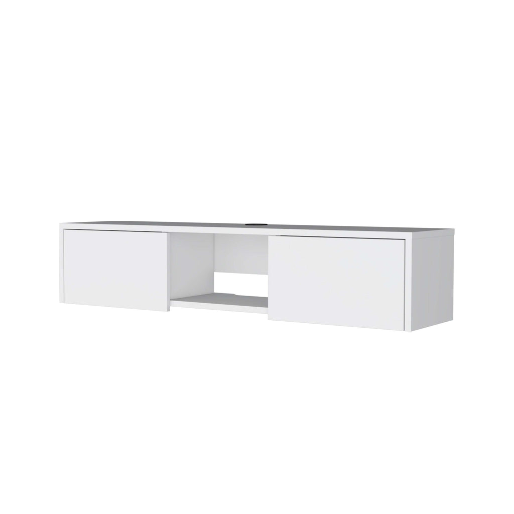The floating TV Stand combines minimalist aesthetics with space-saving functionality in a chic white finish. Designed for wall-mounting, it features two concealed side doors alongside a central open compartment, offering organized storage options with integrated cable management for a clean setup.
