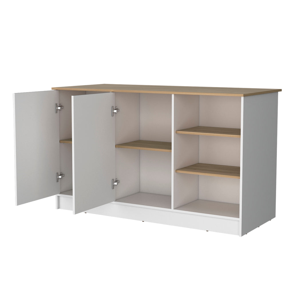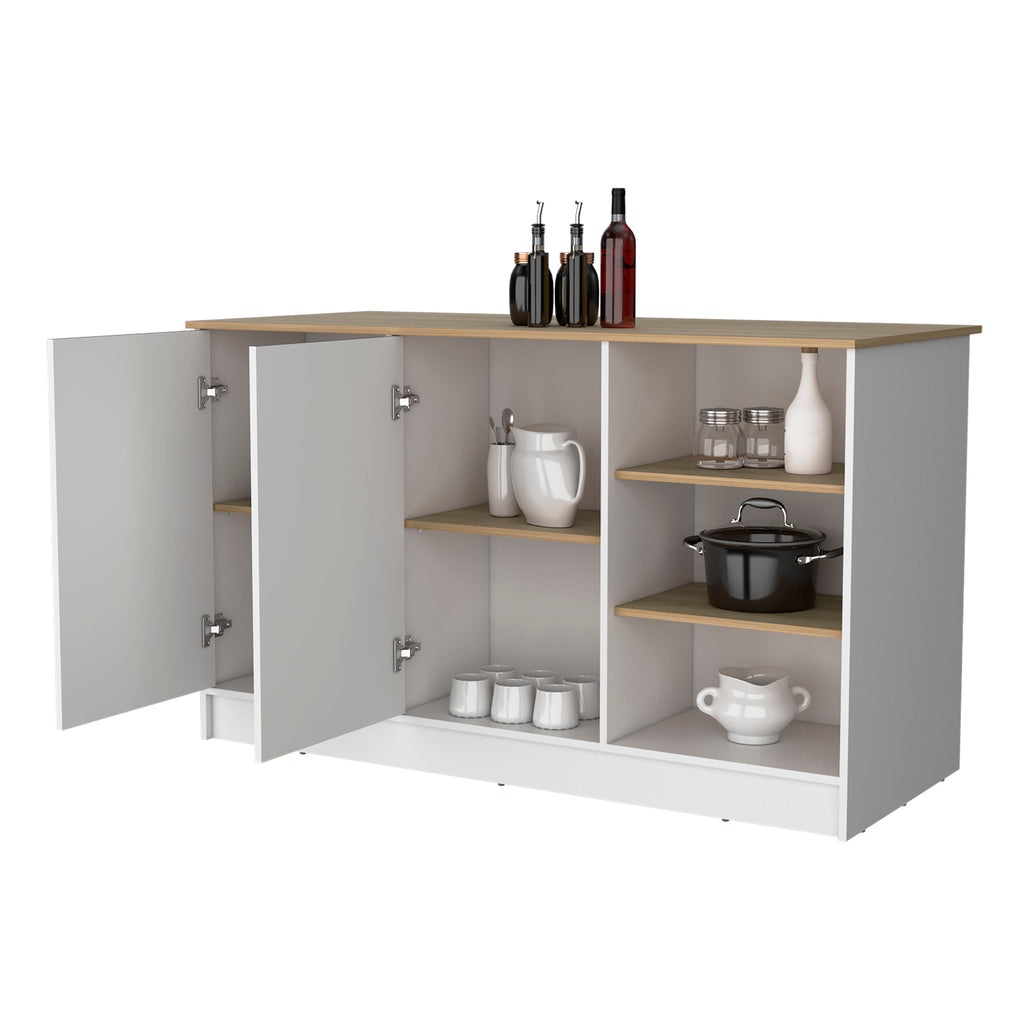 Elevate your kitchen with this sophisticated and functional kitchen island. Designed for optimal organization, it features open storage and two doors concealing internal shelves, perfect for housing all your culinary essentials. Constructed from premium materials, its robust and elegant design integrates seamlessly with any kitchen décor. This kitchen island not only offers additional workspace for meal preparation but also ensures your kitchen remains orderly and efficient. A must-have addition for any well-appointed kitchen.