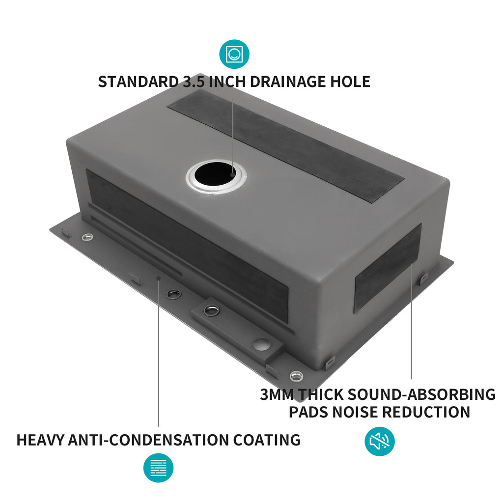 - [Coating and Silencer Pad] There is a thick coating on the outside of the sink to prevent condensation caused by weather changes. In addition, the 3mm thick rubber silencer pad can greatly reduce the noise from the faucet and give you a quieter cooking environment.