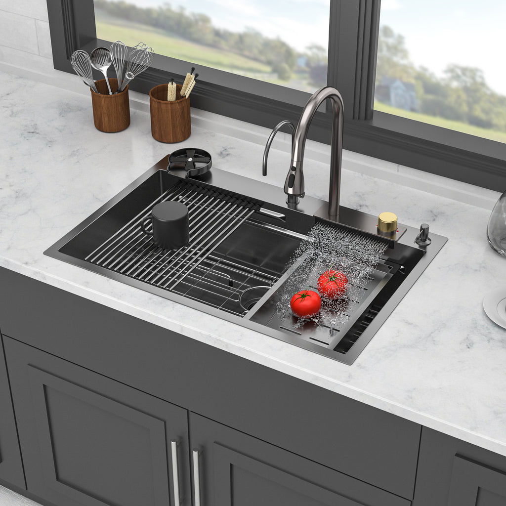 - [Unique Waterfall Design] The Unique Waterfall Kitchen Sink offers an elegant fusion of functionality and design. Boasting 3 water modes - cup wash, waterfall, and faucet. The pull-out faucet offers 3 flow modes, emphasizing a waterfall style. This innovative design elevates kitchen style, minimizing splashes and water waste.