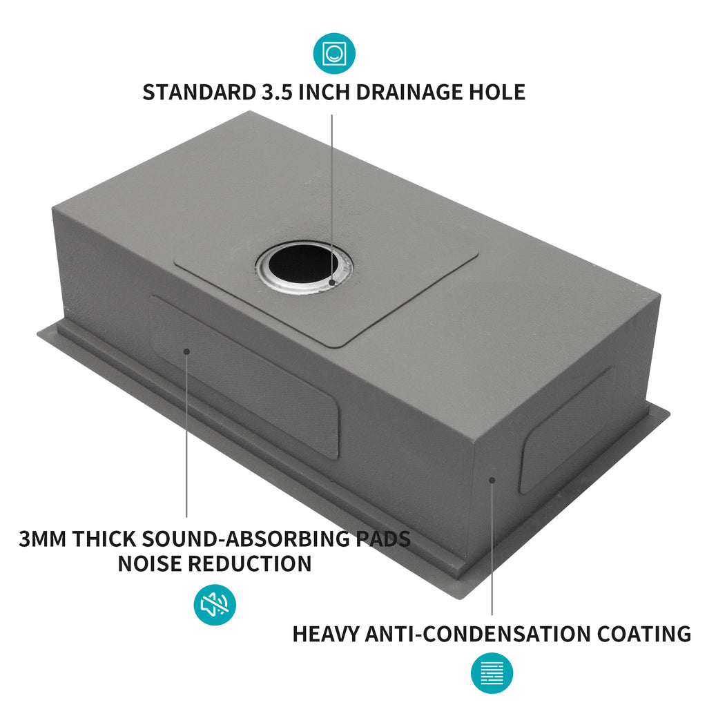 - [Coating and Silencer Pad]There is a thick coating on the outside of the sink to prevent condensation caused by weather changes. In addition, the 3mm thick rubber silencer pad can greatly reduce the noise from the faucet and give you a quieter cooking environment.