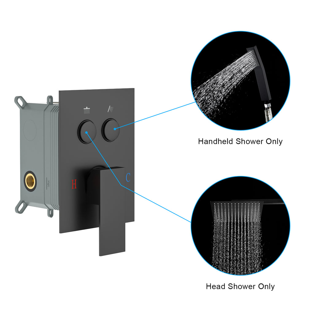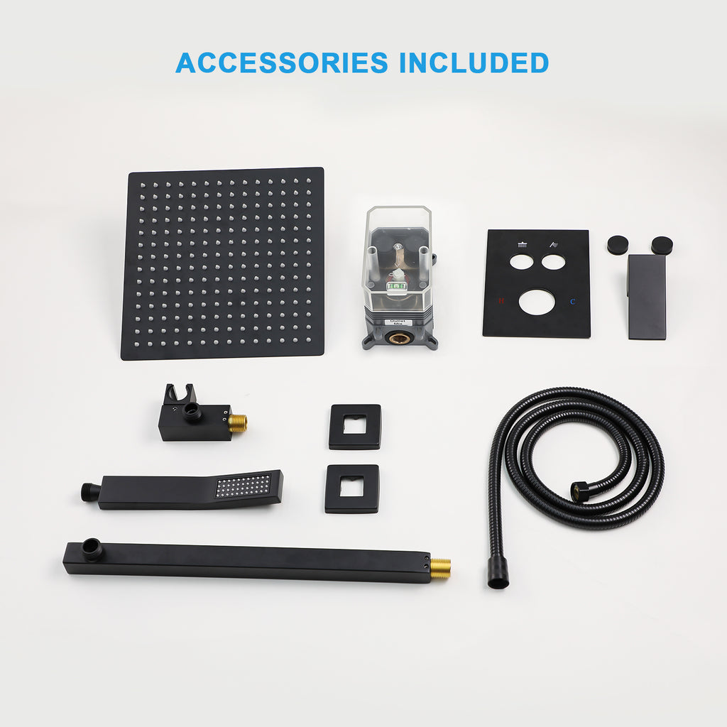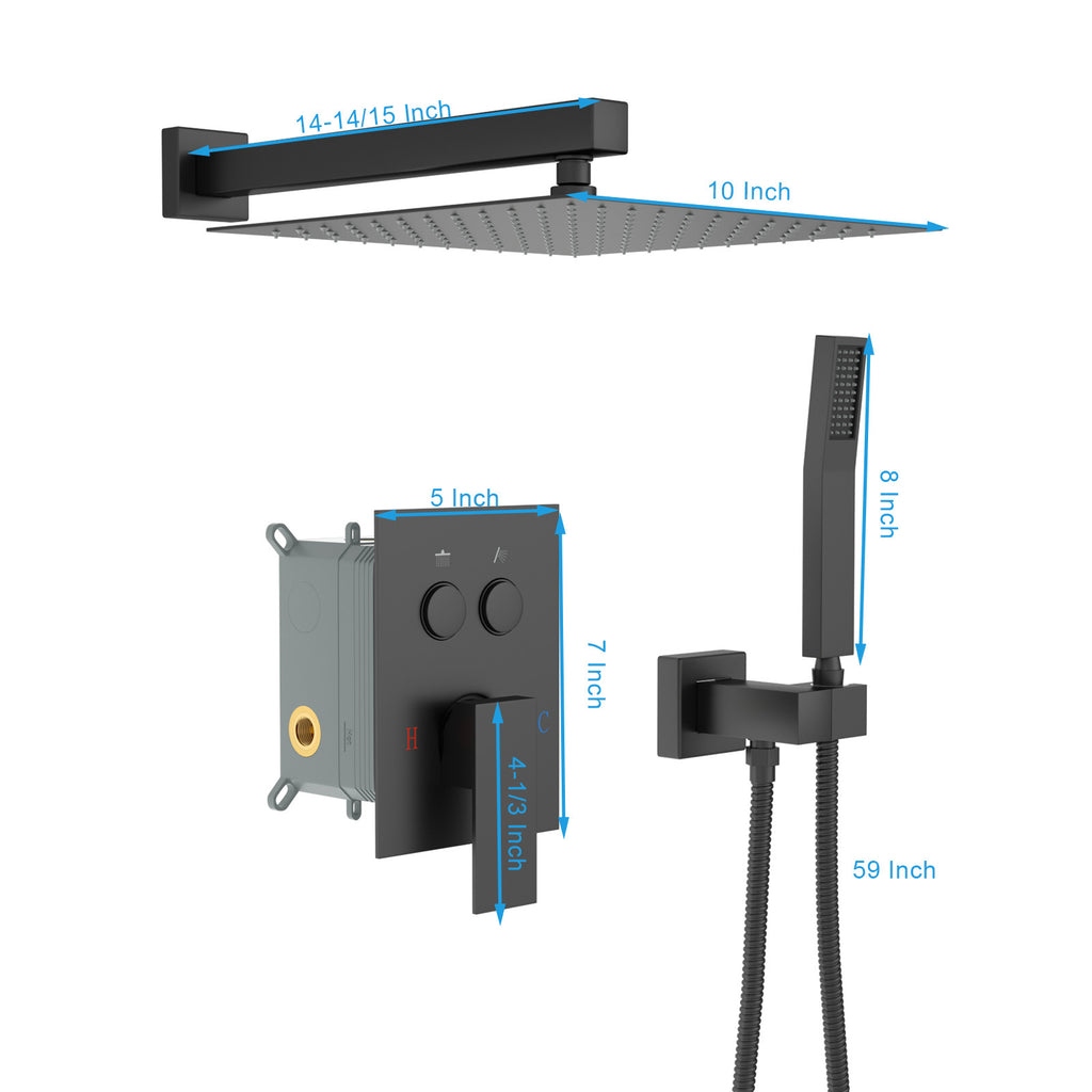 - {Included Components}10 inch Square rain shower head,Shower Arm, handheld shower head, 59' shower hose,shower holder, water control valve,Parts and installation instructions.