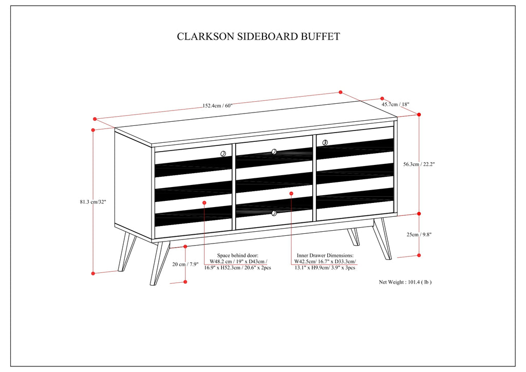 - Mid Century design includes dark brown accent detail, discreet cut out door and drawer handles, angled legs
