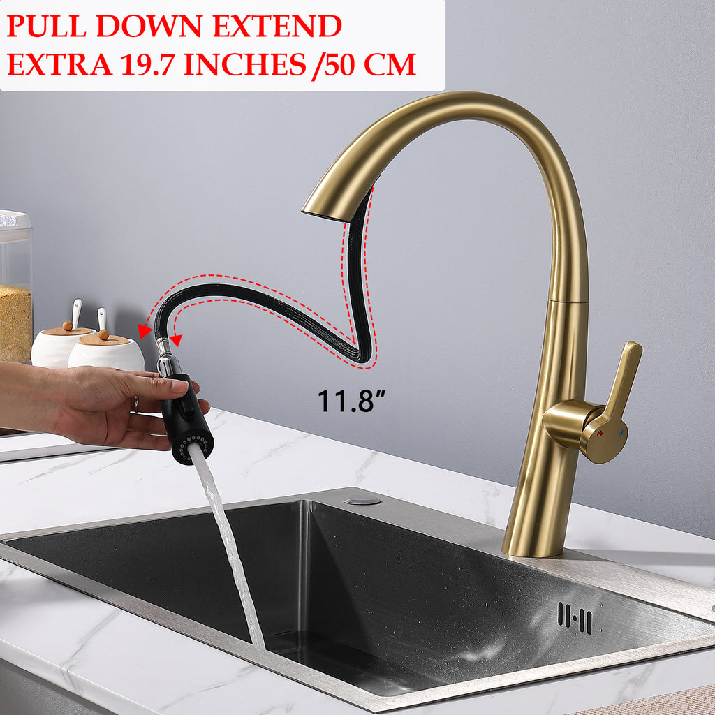 This is a beautiful and elegant single handle kitchen faucet with a simple single handle design and practical pull out spout. It made of SUS304 stainless steel and including a ceramic cartridge, makes the faucet is more durable and resists dirt and corrosion from daily use and easily to clean with a wet cloth. Also, the easy clean nozzles--Soft rubber spray holes allow you to easily wipe away mineral build-up with the touch of a finger for a long-lasting powerful flow. No scrubbing required! High-arch spout and 360-degree rotation offer more room for pots/pans and superior clearance for sink. Pull-down spray wand features a long hose providing a 20 inches reach, hot and cold water control kitchen faucet with the best pressured spray. It has different modes for using, Stream and Spray Functions. Stream for filling water and Spray for rinsing. Silky soft & steady stream and Med-high pressure spray can meet various washing requirements, making cleanup easier.
