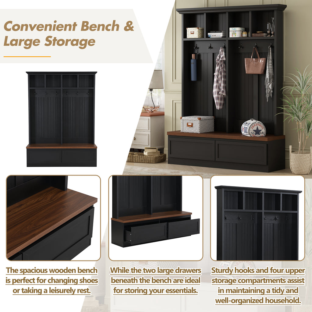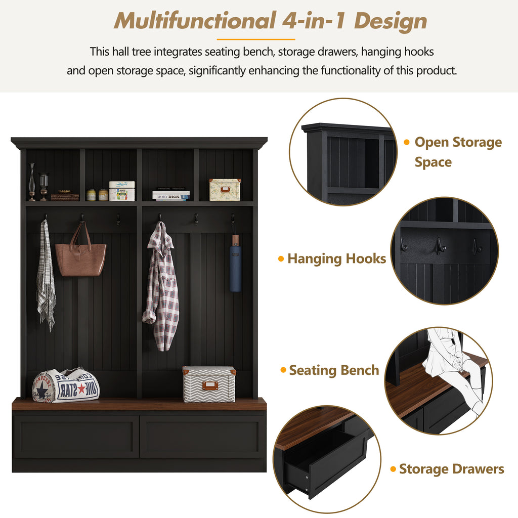 - This hall tree integrates seating bench, storage drawers, hanging hooks and open storage space, significantly enhancing the functionality of this product and providing a comprehensive solution for organizing your entry or hallway area.