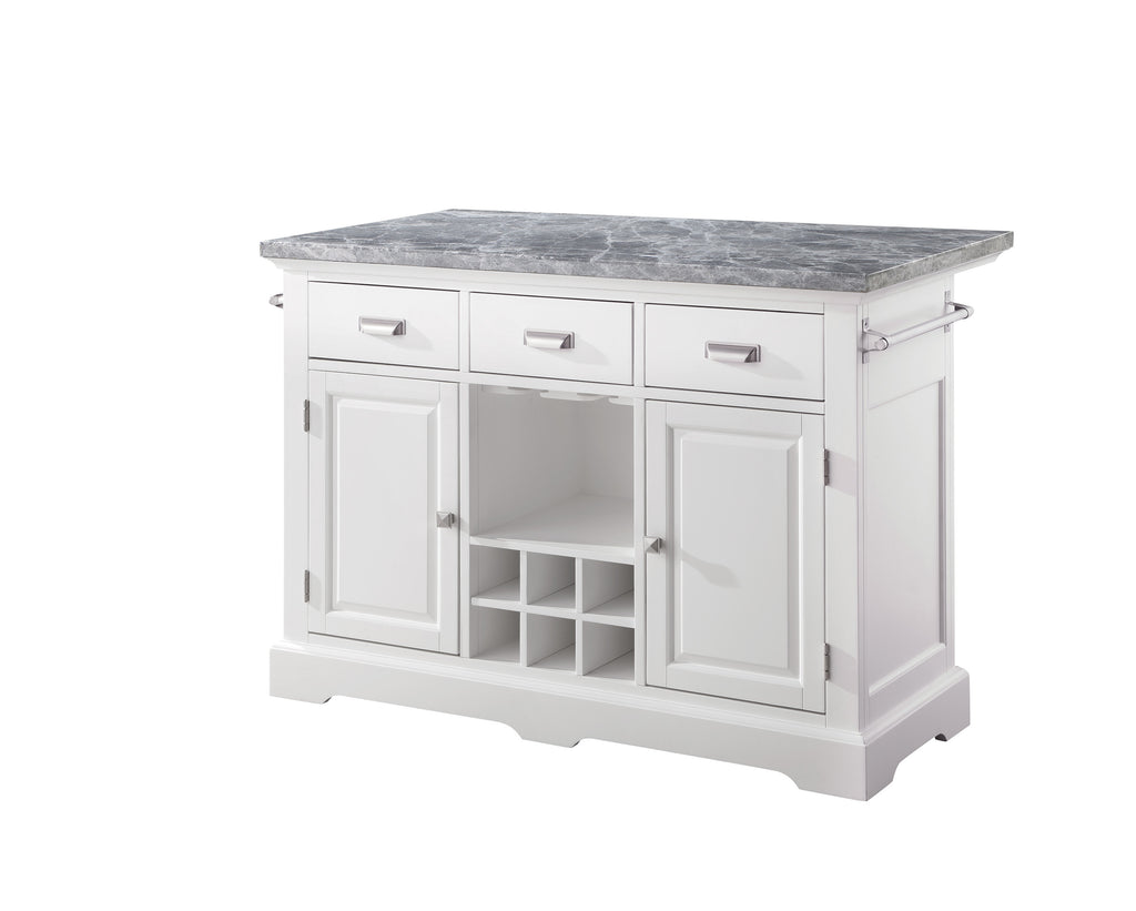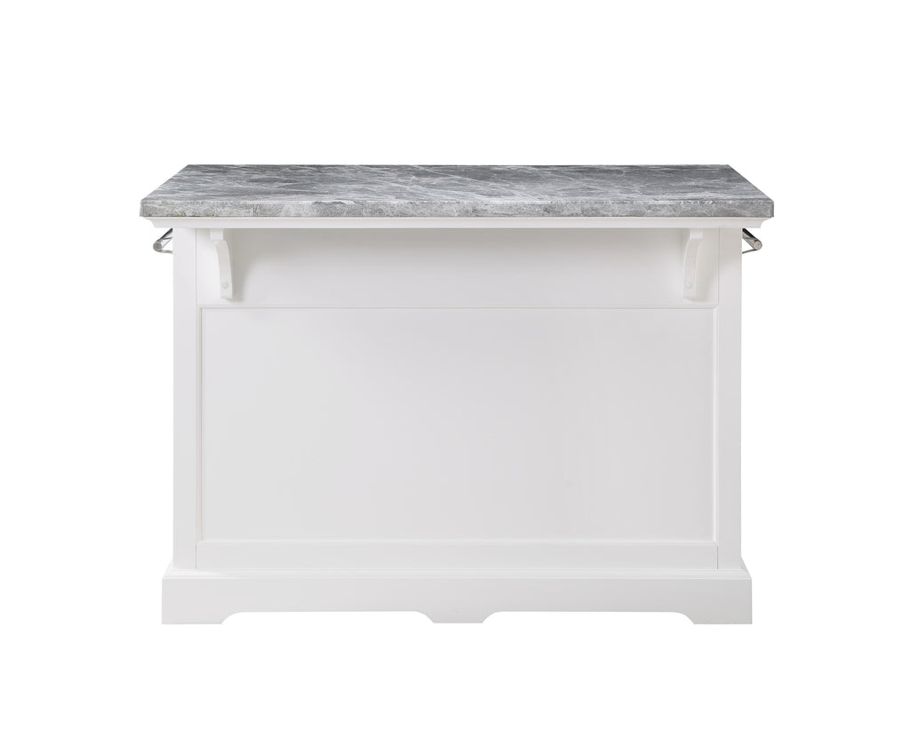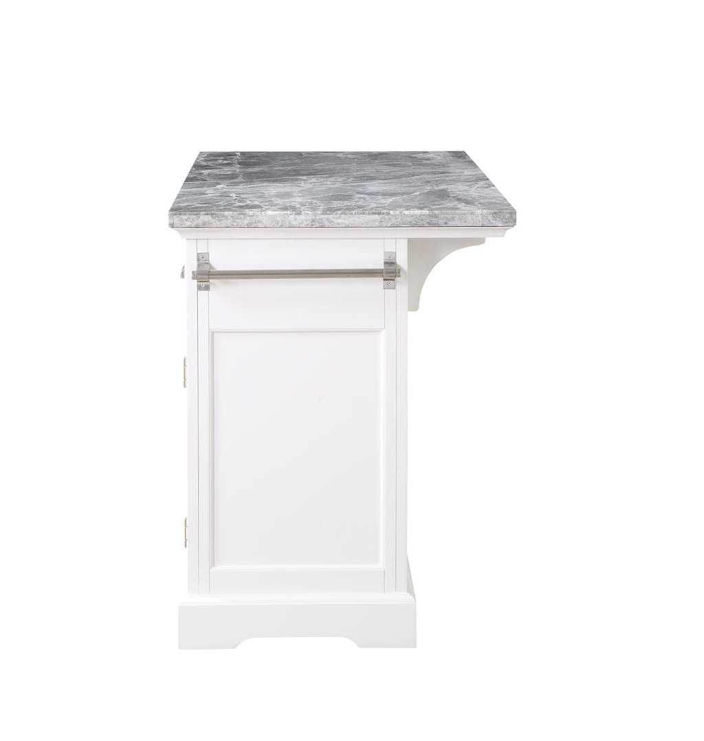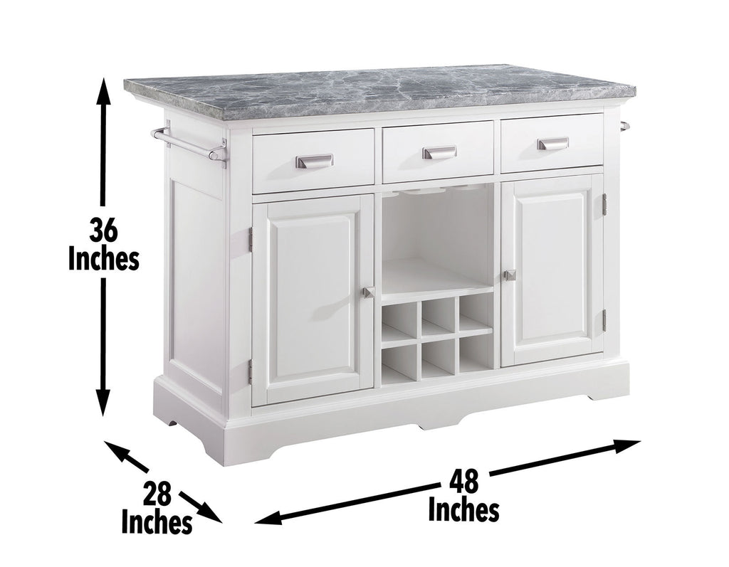 - Features including dual towel holders, bottle storage rack, hanging stemware rack and overhang shelf for counter seating.