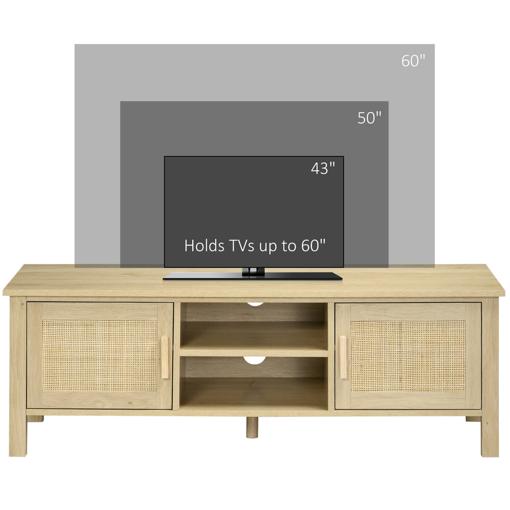 - Add Boho Chic: Our entertainment stand is a beautiful Boho-chic piece with a natural color palette and two hand-woven genuine rattan swinging doors. It's capable of holding a TV up to 60 inches.