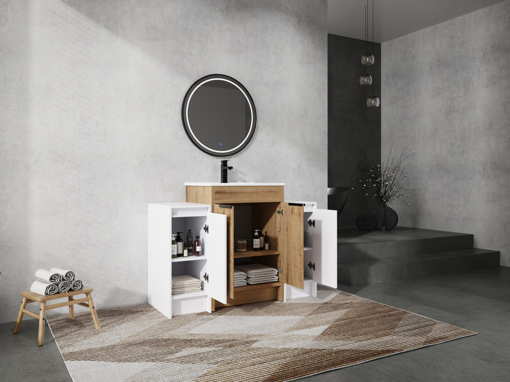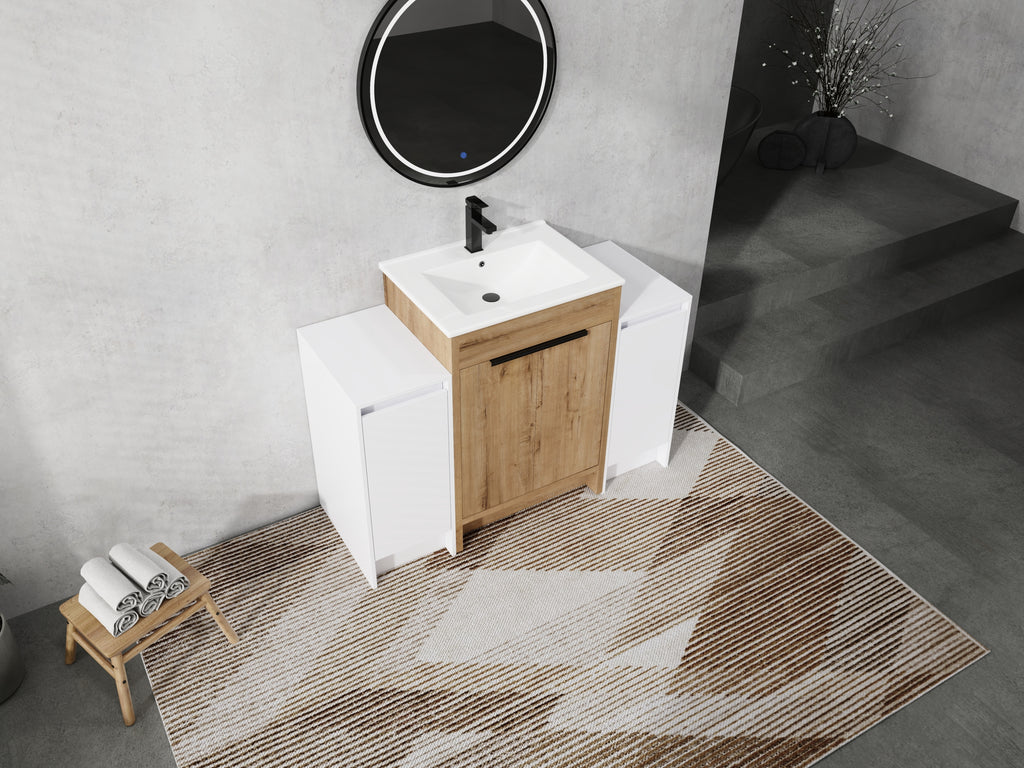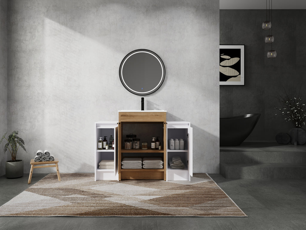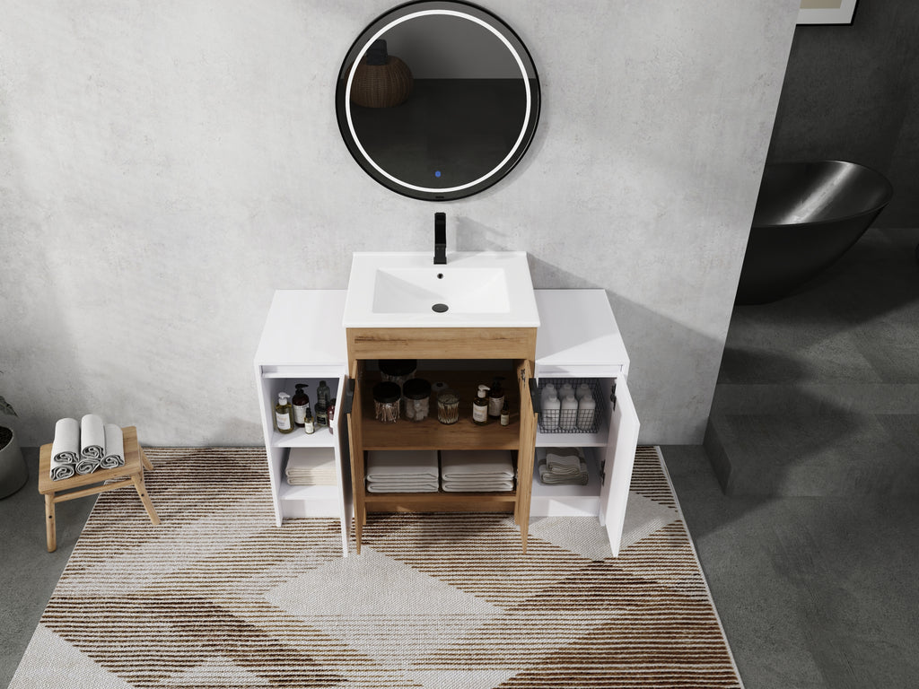- Bring luxury to your bathroom with our contemporary bathroom vanity. Store all your essentials with ease in the ample bottom storage.