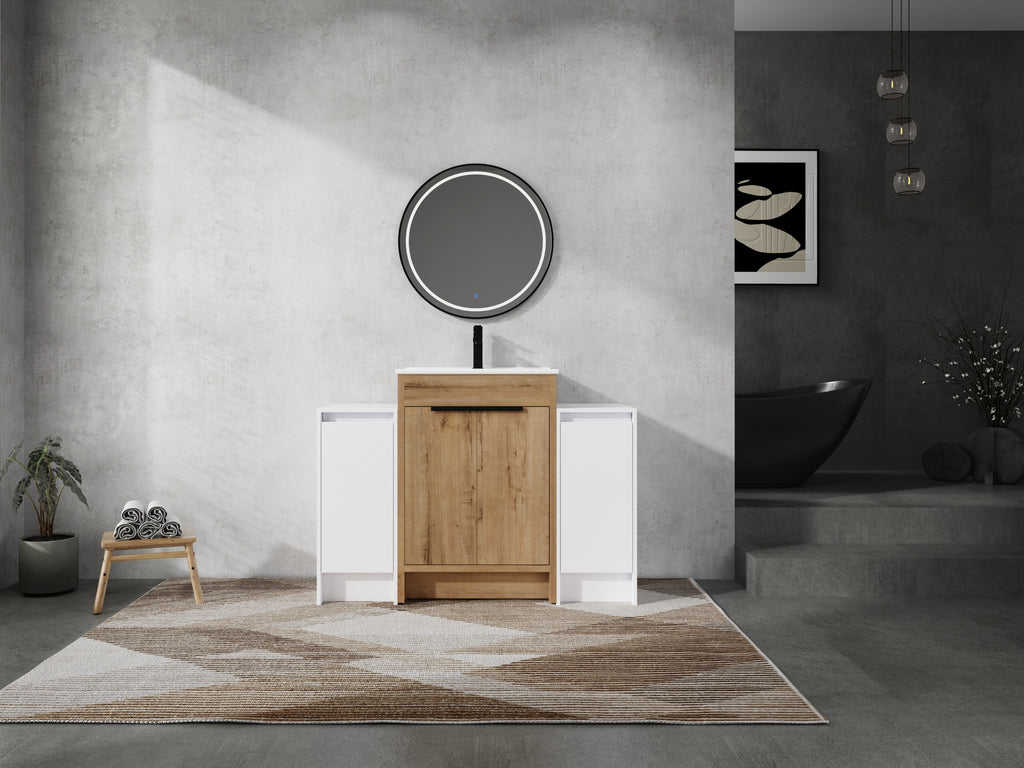 This freestanding bathroom combination cabinet not only boasts strong functionality but also incorporates a modern minimalist design, seamlessly blending with the overall decorative style of the bathroom. The integrated design of bathroom cabinet and basin makes the product more concise and elegant. The vanity of the bathroom and the storage cabinet are both equipped with adjustable shelves, which can provide classified placement of daily necessities for the bathroom. The additional combination of two independent small storage cabinets provides a lot of extra space for the bathroom.