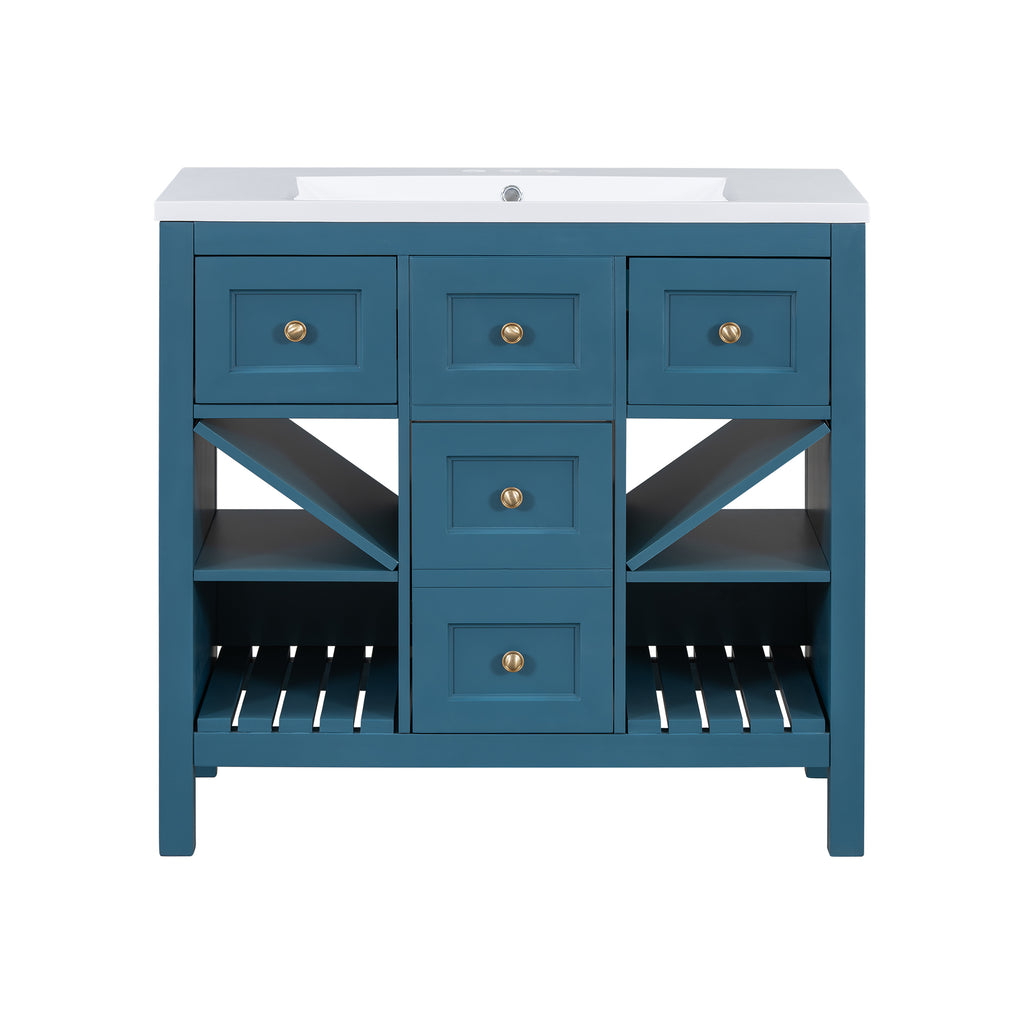 - [Amber Storage] In order to meet your storage needs for various items, this bathroom vanity is equipped with very sufficient storage space. The entire bathroom cabinet has five drawers for daily necessities, and a cabinet for medium and large items .