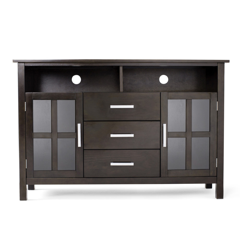 - Features tempered glass doors that open to cabinets with one (1) adjustable shelf each, three central drawers with metal drawer glides and open top space for media devices.