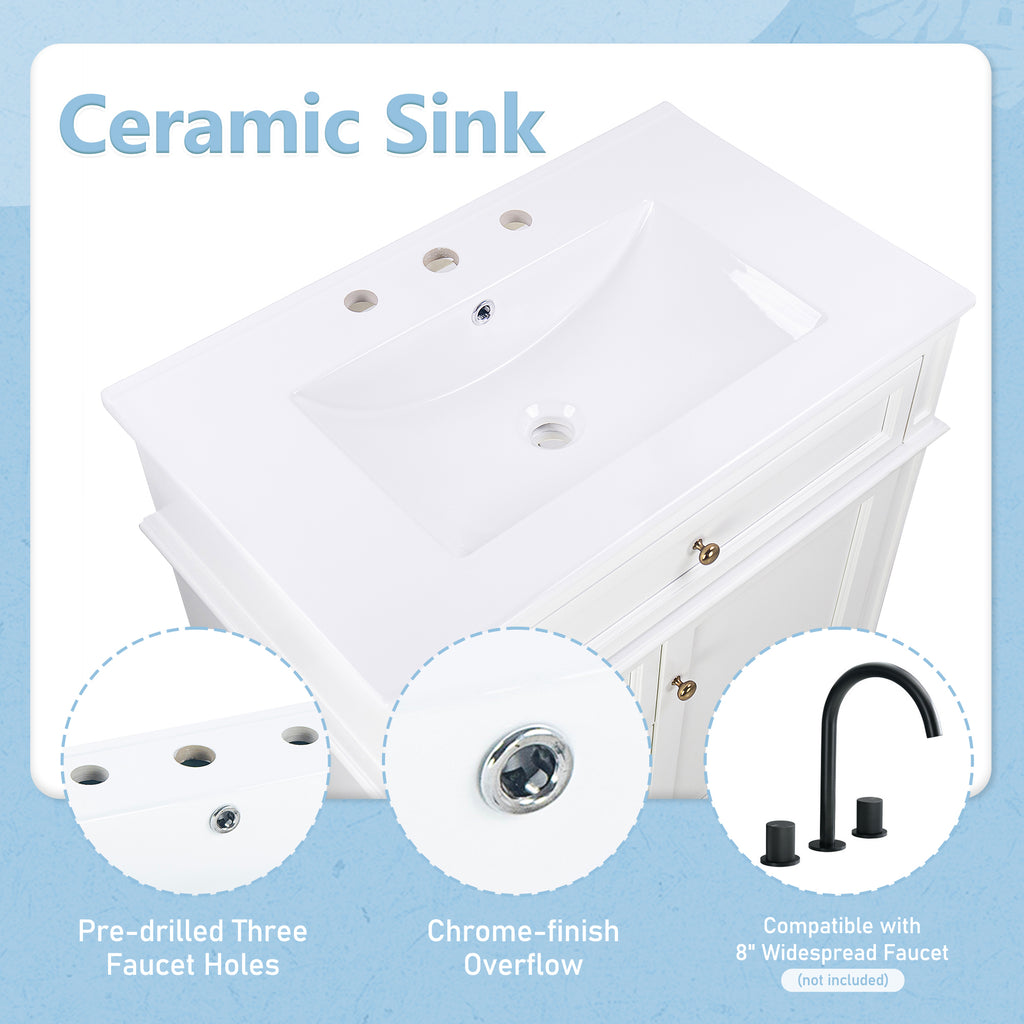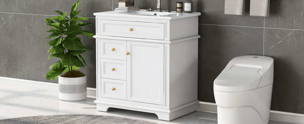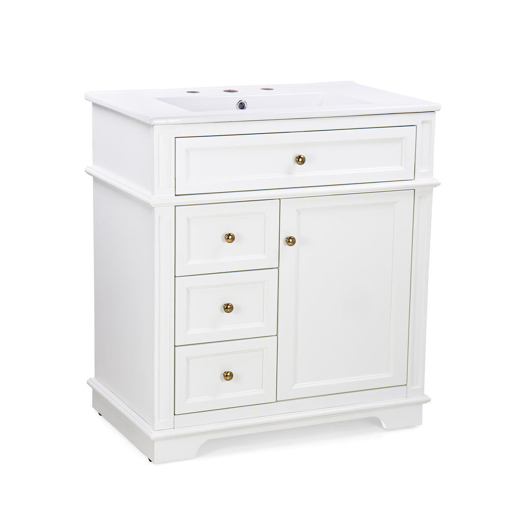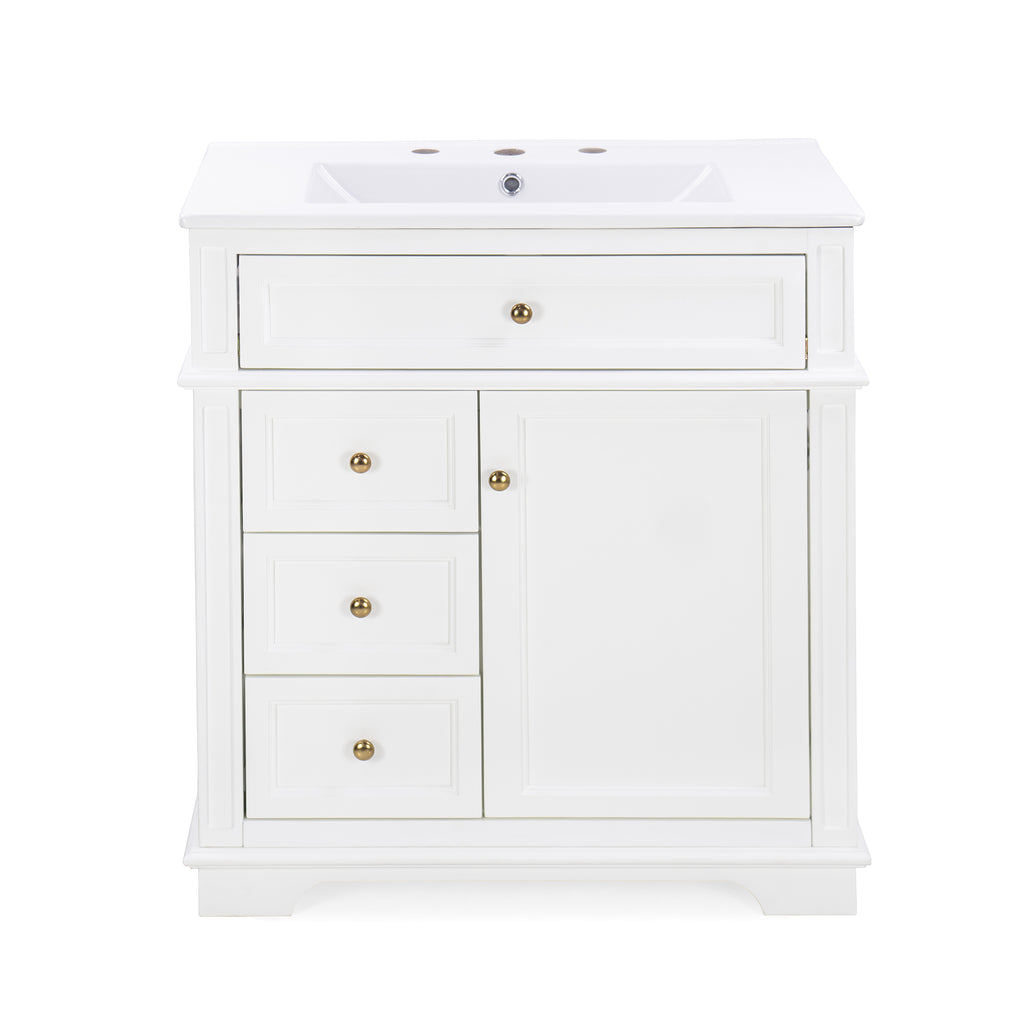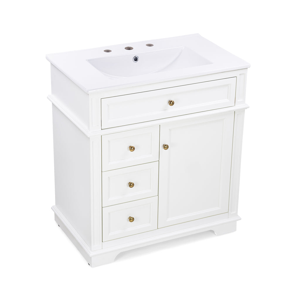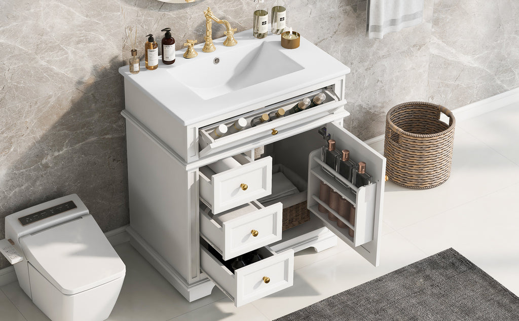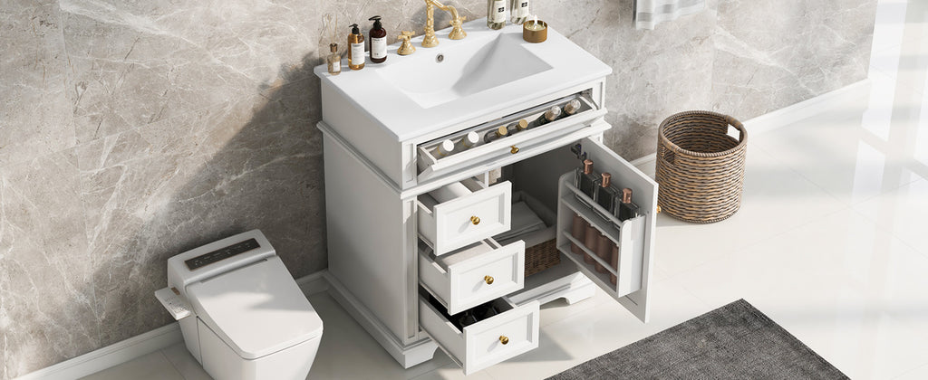 - Vanity with Cabinet & Door Shelf & Drawers: This bathroom vanity has ample storage space: one cabinet with door shelf, one big tip-out drawer and 3 drawers with silde rails. You can put soaps, towels, shampoos, tissue paper and other bathroom essentials in it so to keep them away from dust.