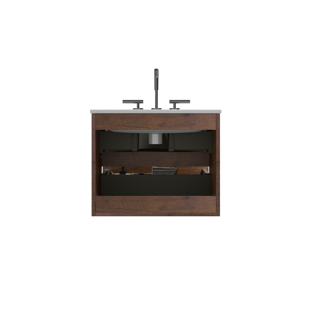 The double drawers maximize the use of space, offering a 20% increase in storage capacity to keep your bathroom essentials organized and within reach. And thanks to the DTC soft-closing silent drawer runners, you can enjoy a serene environment, free from disruptive noises. Featuring an integrated 45° sloping handle-free design, it embraces a minimalist approach to design. The sleek Walnut cabinet enhances the visual appeal and creates a seamless look, adding a touch of modern refinement to your bathroom.