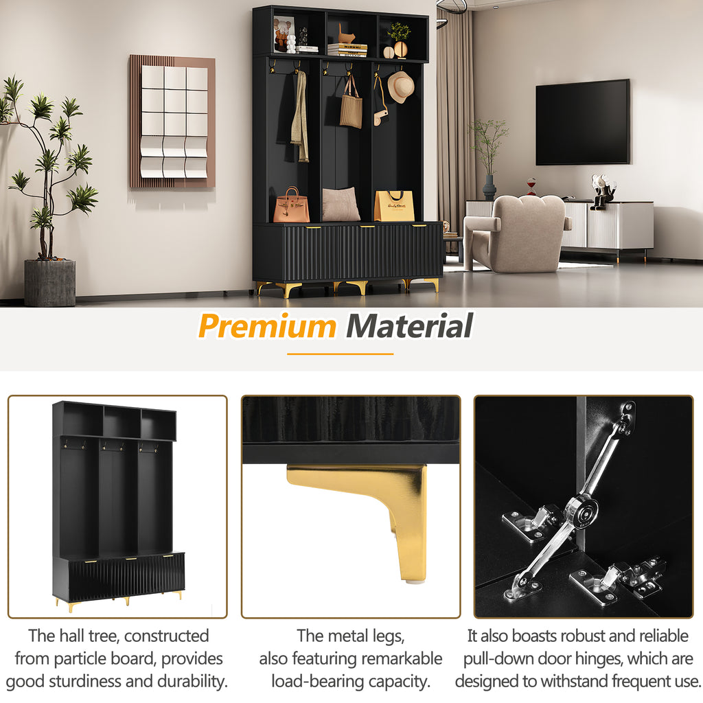 - This hall tree is a bright and glamorous storage cabinet with high gloss fluted textured doors, paired with shiny golden hooks, handles and legs. Its modern and elegant appearance design will enhance the decorative style of any living space.