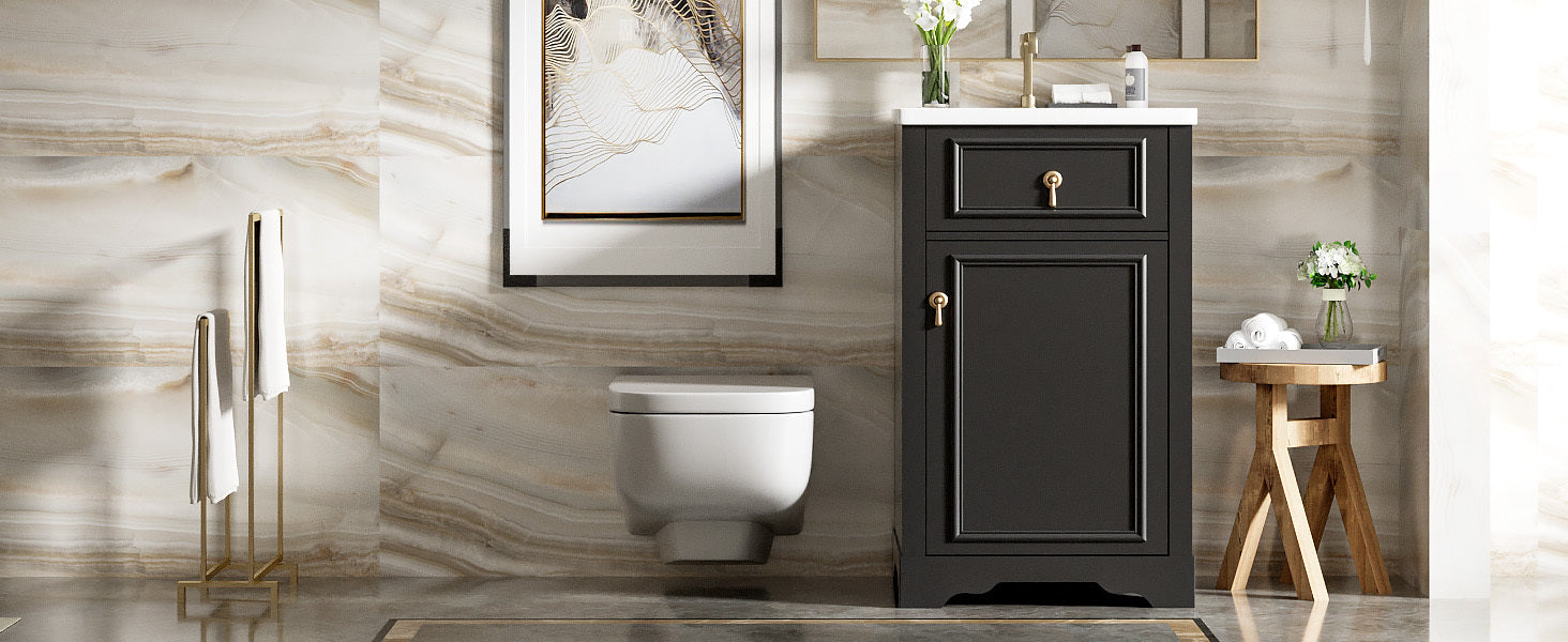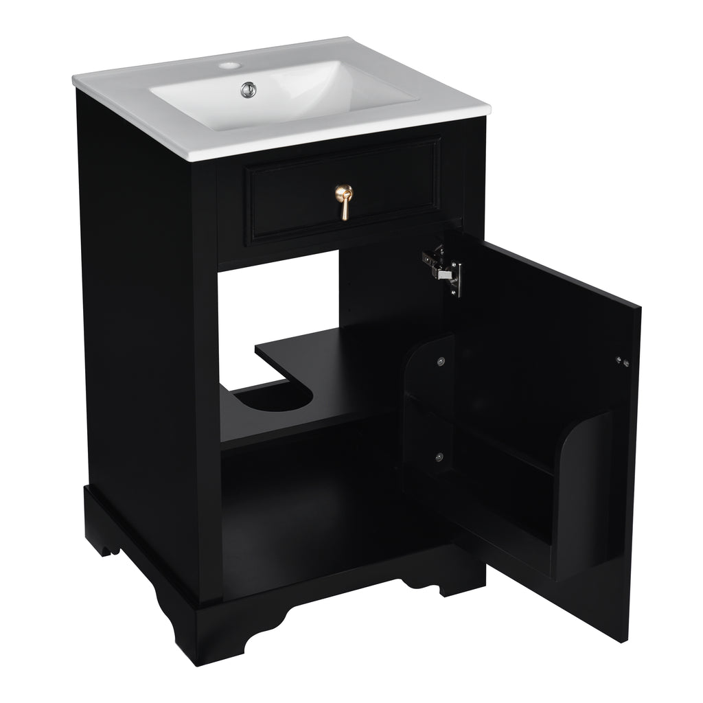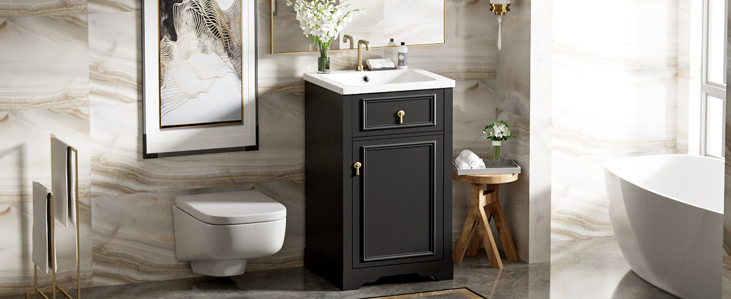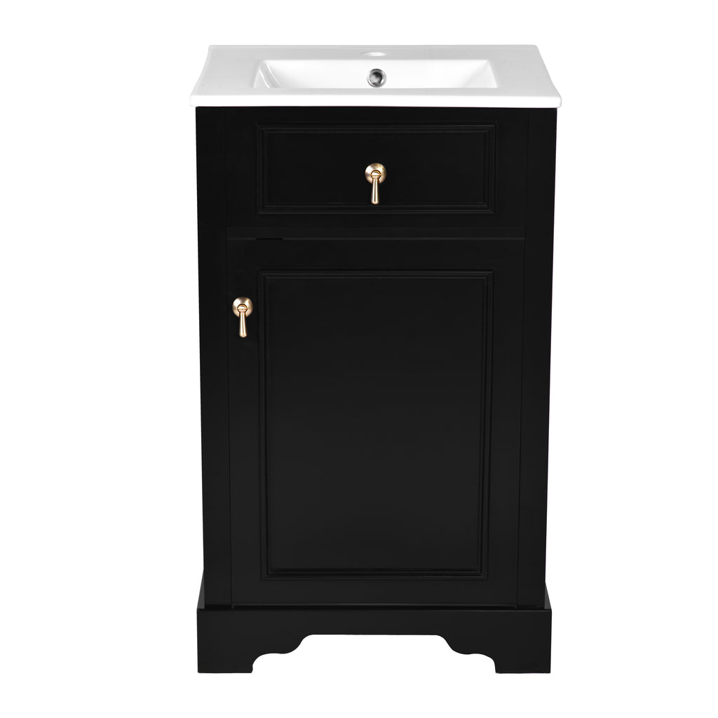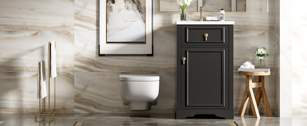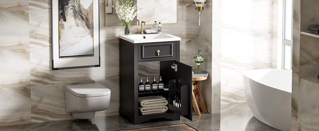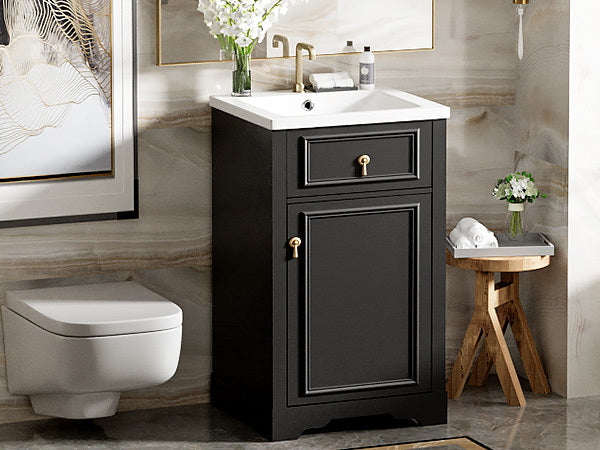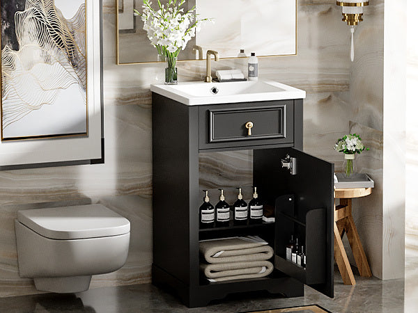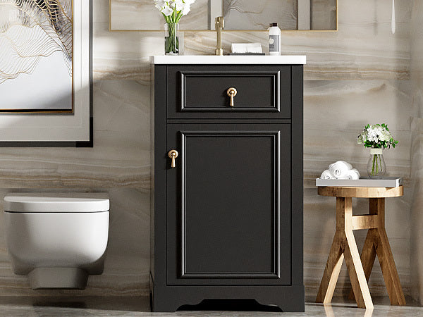 Upgrade your bathroom with our 20-inch black vanity, a perfect blend of functionality and timeless elegance. Picture the smooth ceramic sink, gleaming under soft light, offering easy maintenance and daily convenience. The vintage water-drop shaped metal handle adds a touch of nostalgia, inviting you to open its soft-close doors with a whisper.