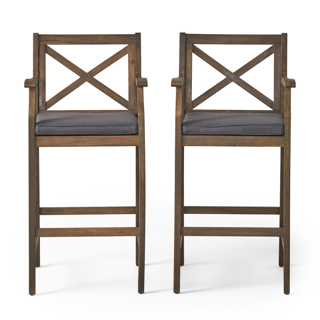 Give your outdoor dining or bar area an inviting transitional vibe, bringing a subtly upscale flair to even the most unassuming home. Composed of rich acacia wood and topped with cozy water-resistant cushions, this set of two classy, yet modern barstools will not only provide hardy durability but will also complement any outdoor bar or dining set up. These are finished with a beautiful cross-back design that strikes a perfect balance of farmhouse charm and stunning sophistication for all to admire. Includes: Two (2) Outdoor Dining Barstools Frame Material: Acacia Wood Cushion Material: Water Resistant Fabric Multiple Color Options Assembly Required Dimensions: 24.00 inches deep x 22.50 inches wide x 45.75 inches high Seat Dimensions: 18.50 inches deep x 18.50 inches wide x 28.50 inches high Seat Cushion Thickness: 2.50 inches Arm Height: 38.25 inches Weight Capacity: 400 lbs Country of Origin: Vietnam