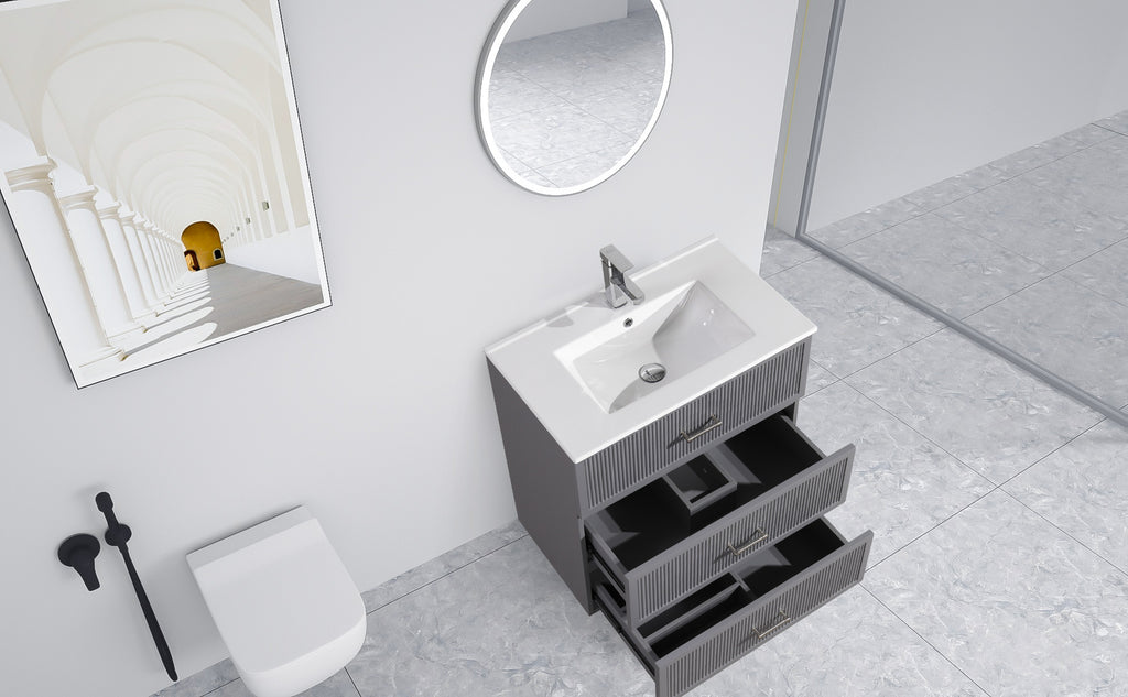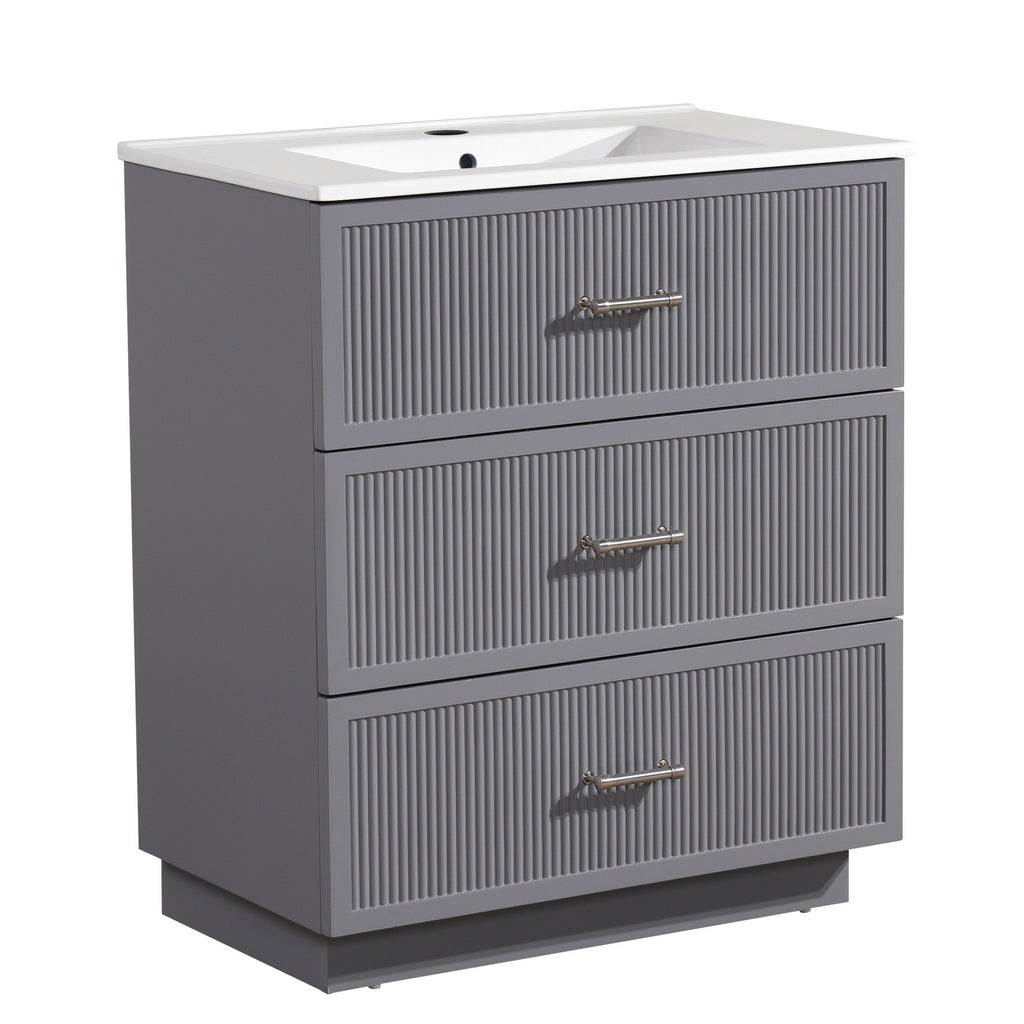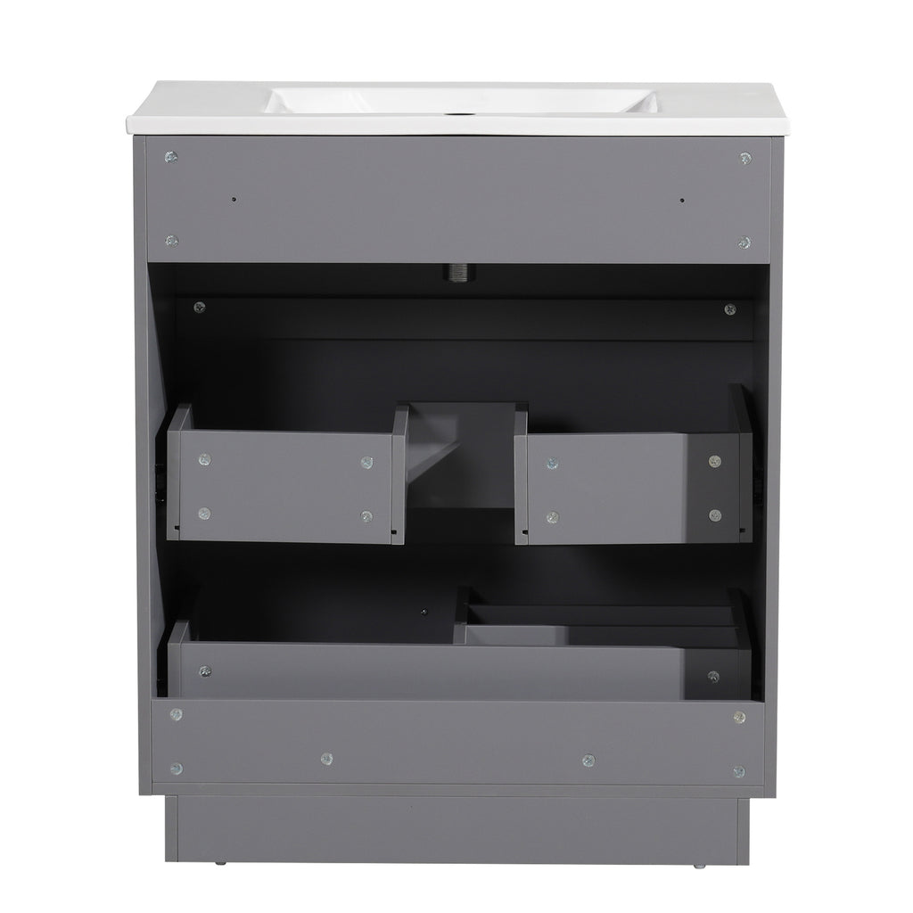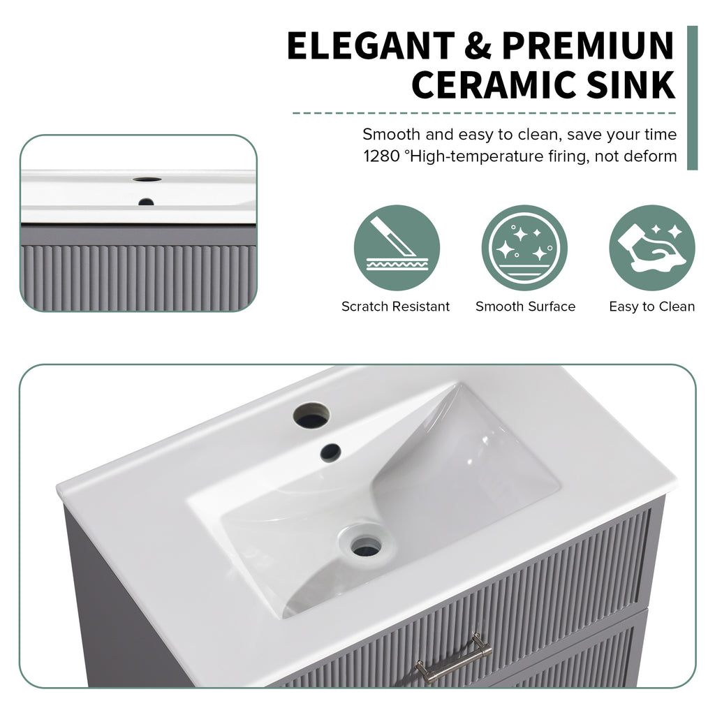 'This 30 inch bathroom vanity with a ceramic sink set combines modern design and functional storage, making it a perfect addition to any bathroom. The freestanding vanity features a high-quality ceramic sink and two spacious drawers, providing ample storage space for your bathroom essentials.