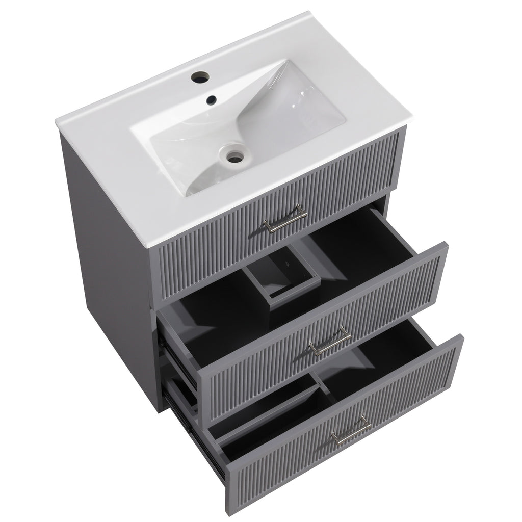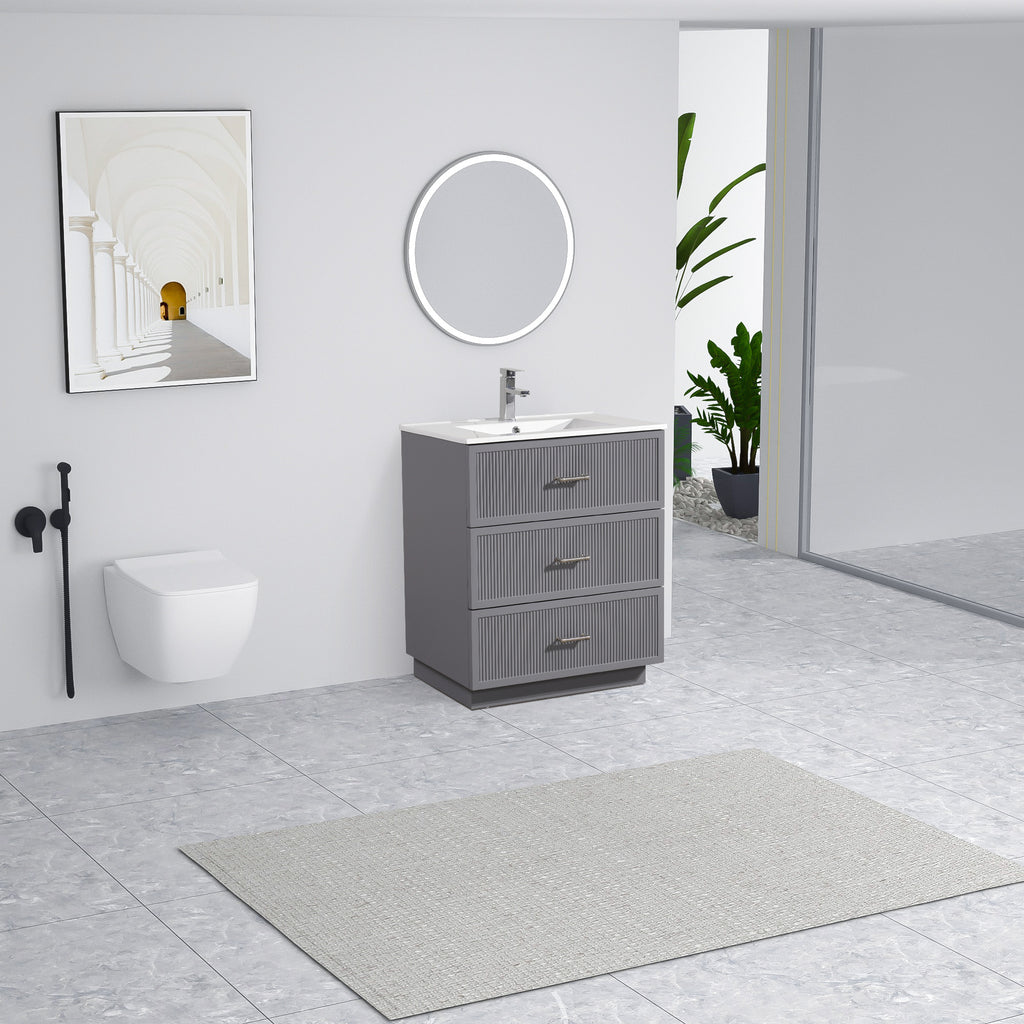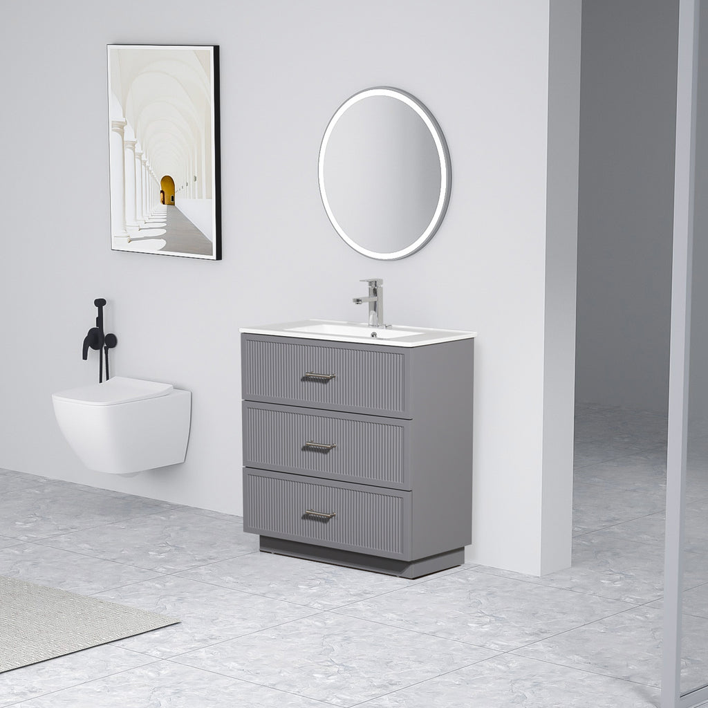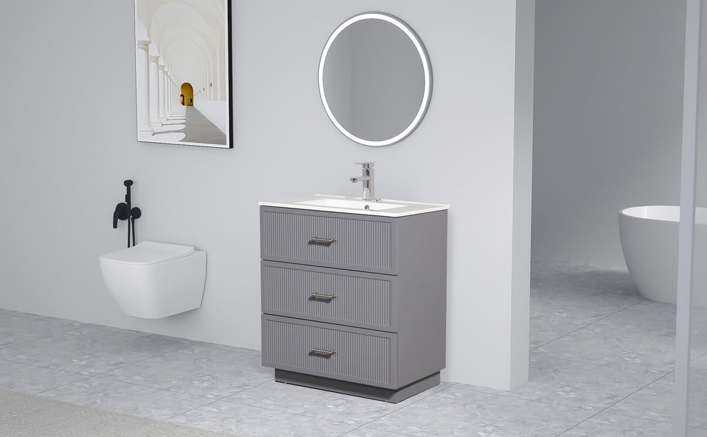 'This 30 inch bathroom vanity with a ceramic sink set combines modern design and functional storage, making it a perfect addition to any bathroom. The freestanding vanity features a high-quality ceramic sink and two spacious drawers, providing ample storage space for your bathroom essentials.