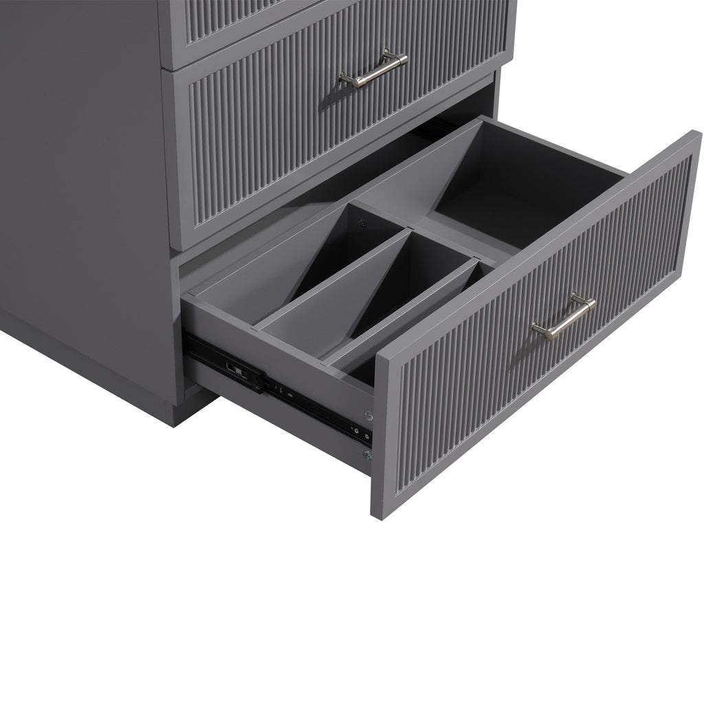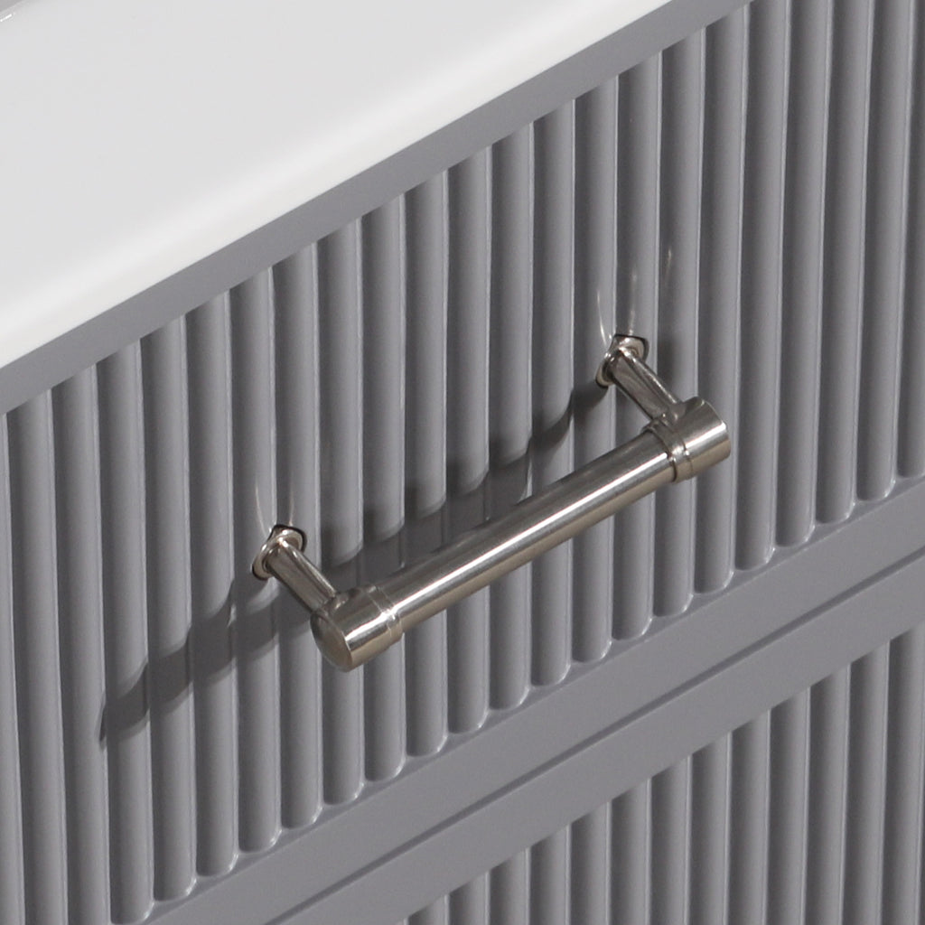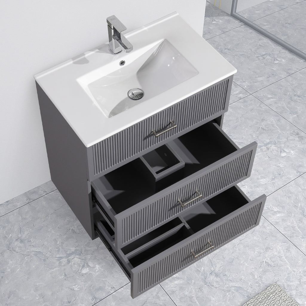 - Modern Bathroom Vanity : Our bathroom sink vanity features a smooth ceramics basin and two drawers, with sleek metal handles and fashionable stripe design. The overall dimensions of this freestanding bathroom sink cabinet 29.75'L x 18.25' W x 34.13'H. (Faucet and pop-up device not included.)