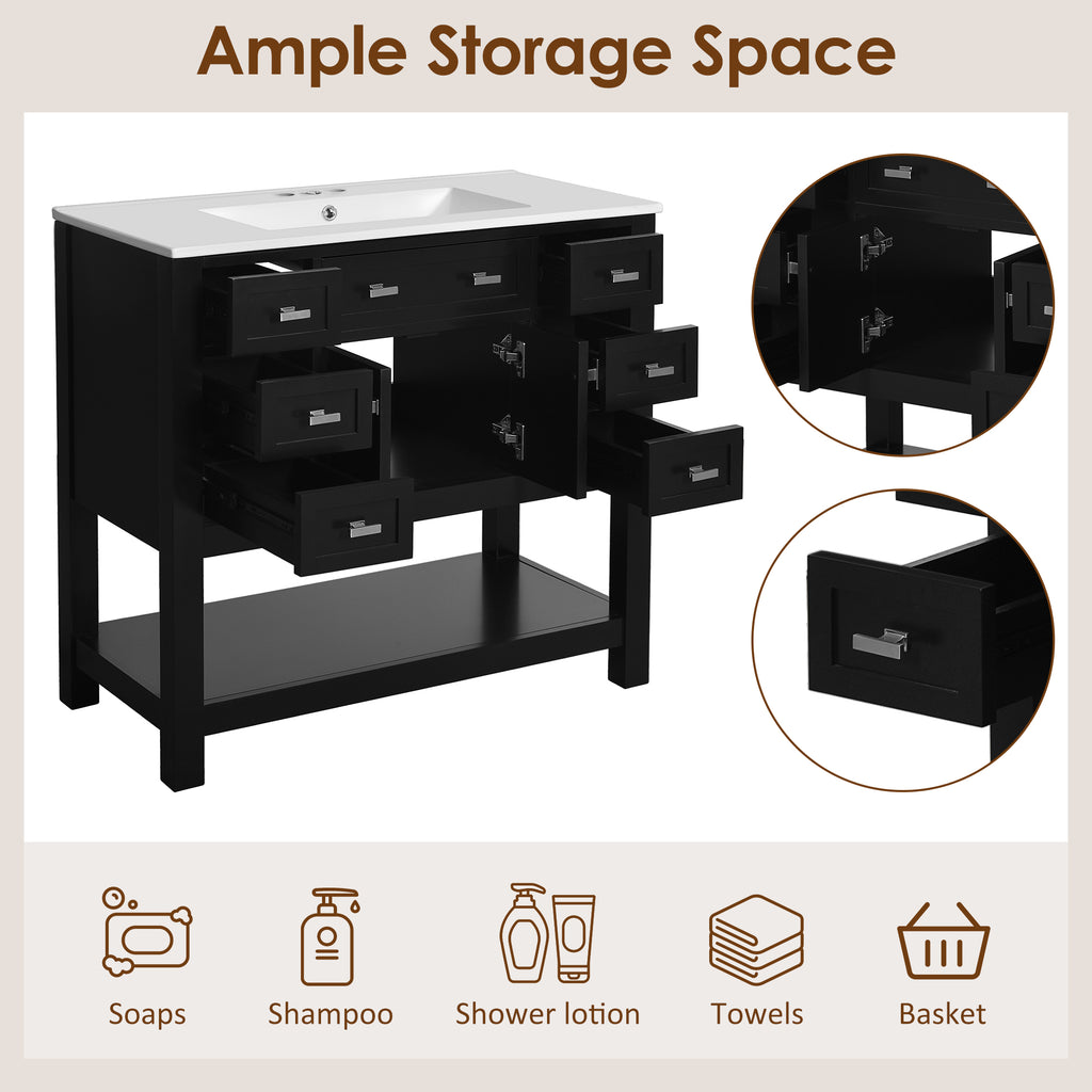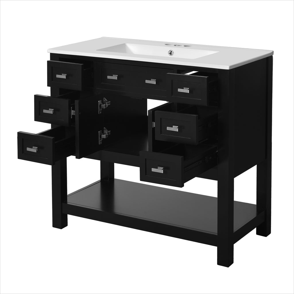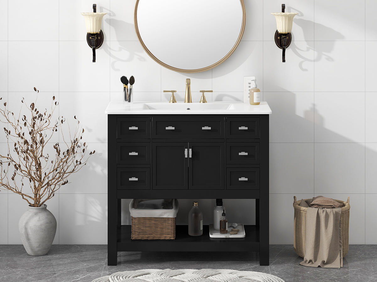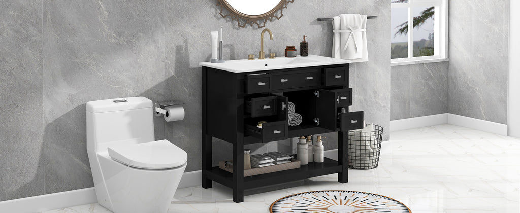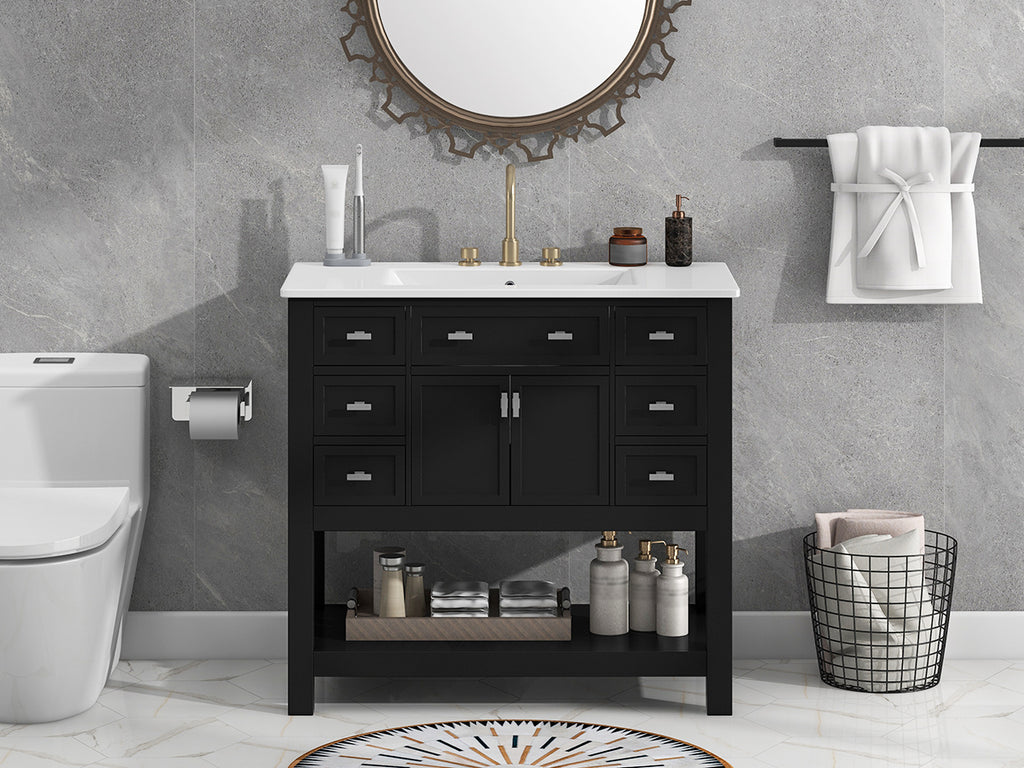 This modern bathroom vanity is built with high quality MDF and solid wood frame, the overall design is simple and generous, and the black appearance adds a sense of fashion. Measuring 36 inches, it comes with 6 drawers and 1 storage cabinet, providing you with abundant storage space for organizing and storing bathroom supplies. There is a large storage divider at the bottom, which can accommodate more daily items and improve space utilization. The mounted ceramic basin is not only sturdy and durable, but also easy to clean, in line with the needs of modern bathrooms, the perfect combination of practicality and aesthetics, is the ideal choice for your bathroom decoration.
