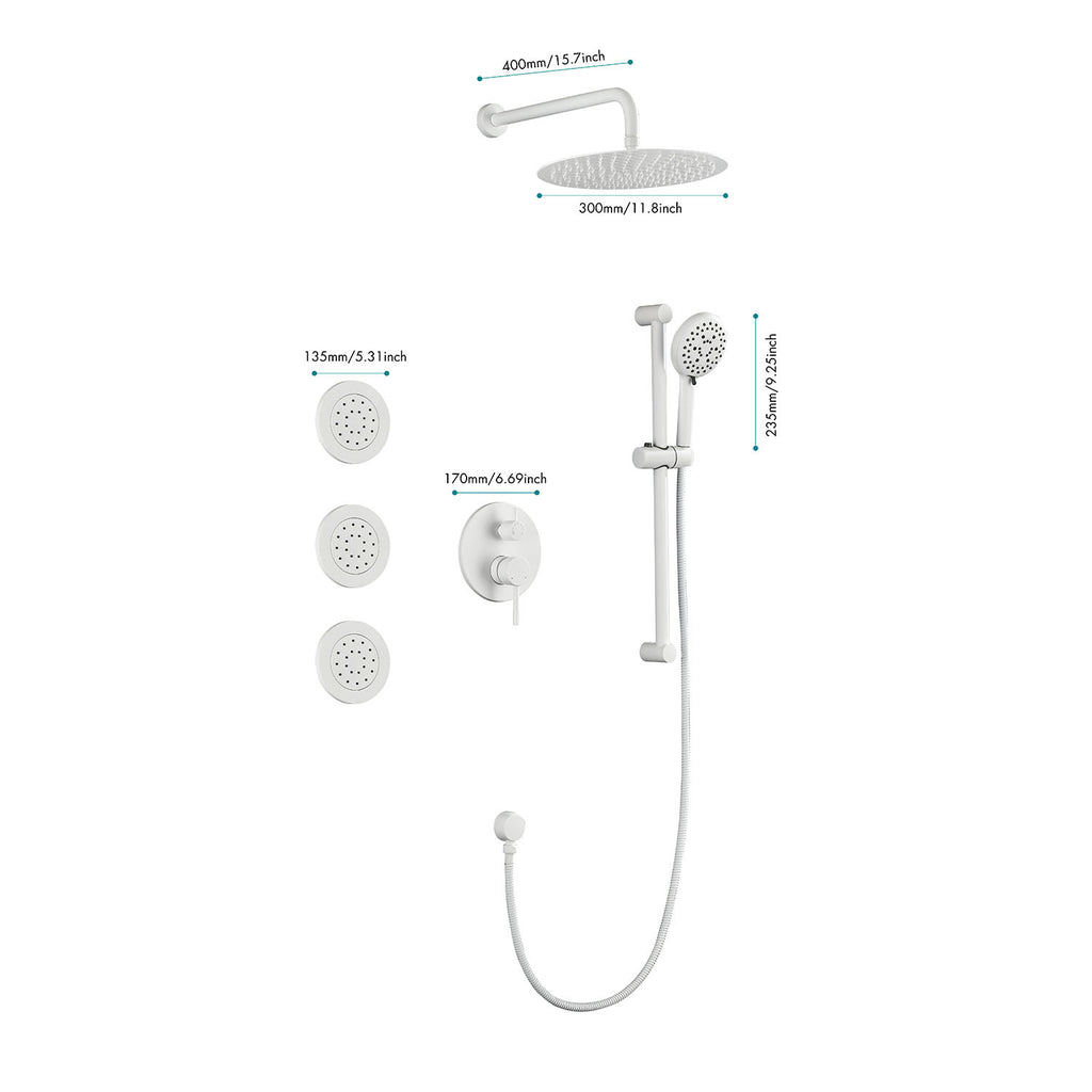 - Installation method: wall-mounted.Includes: shower head, hand shower head, slider, body spray, 59-inch shower hose, water control valve, mounting hardware included.