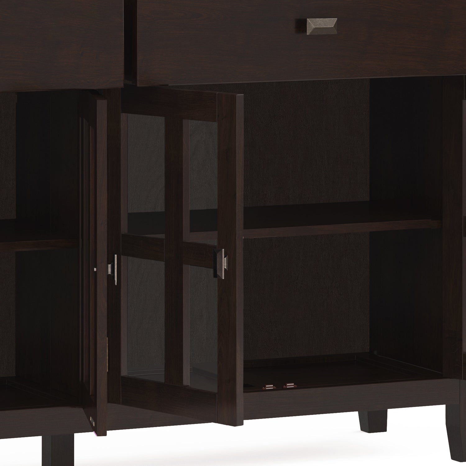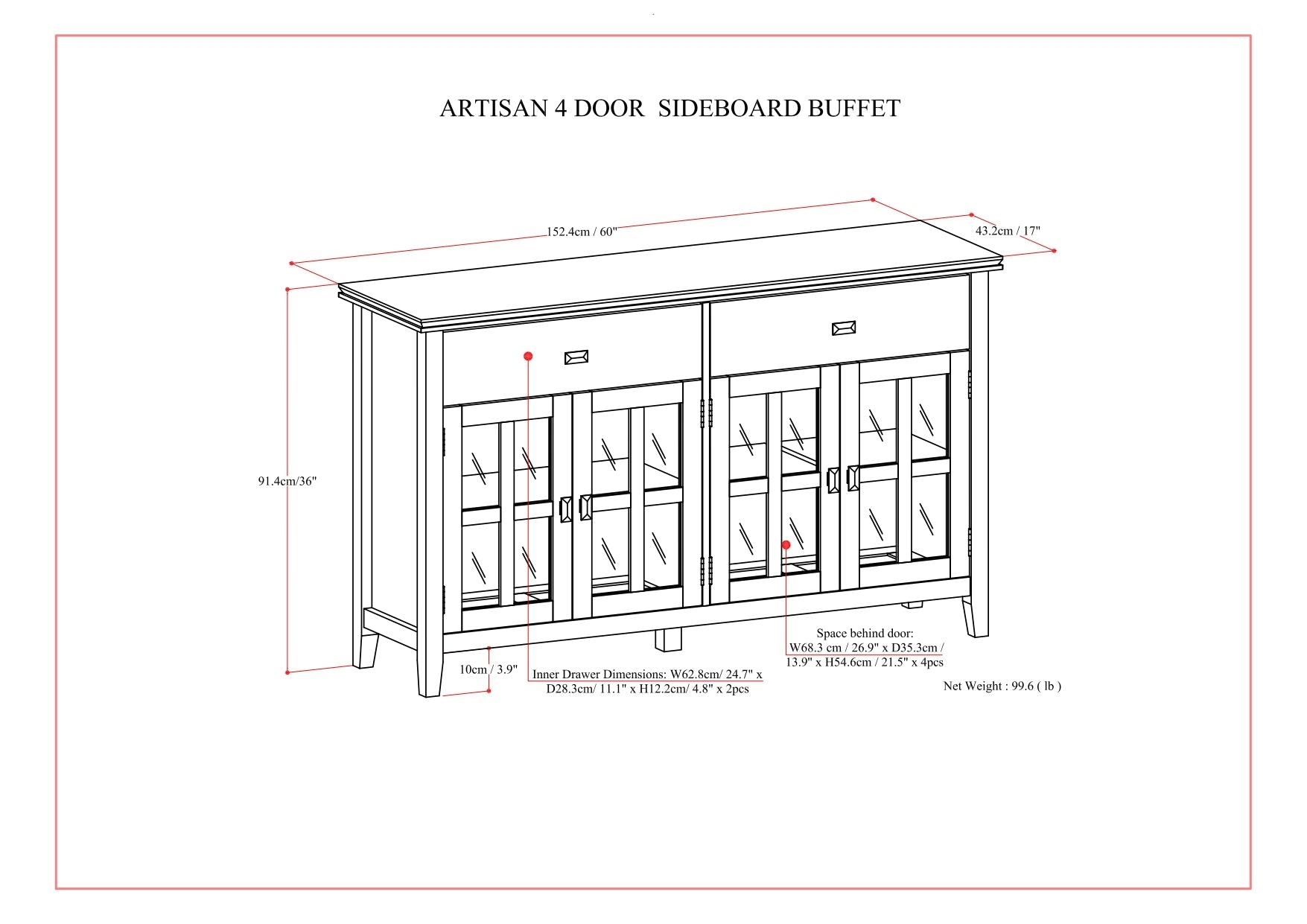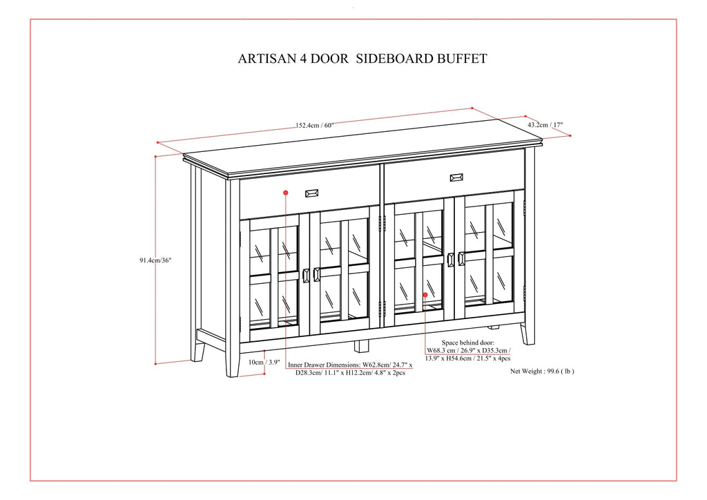 - Features two (2) top drawers with sturdy ball-bearing metal drawer glides for smoother drawer movement, and four (4) doors with tempered glass that open to large storage spaces with one (1) shelf each