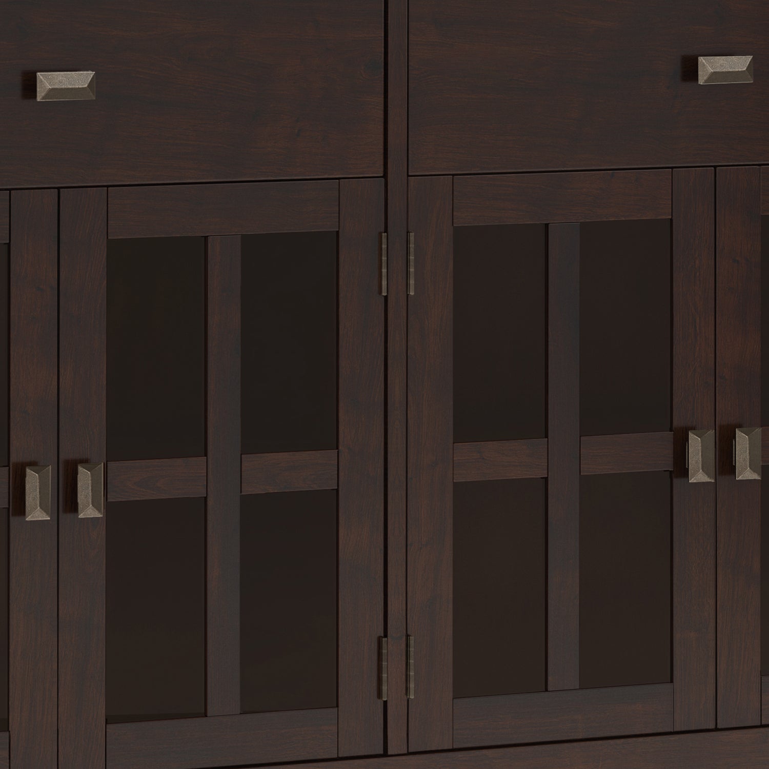 - Transitional style includes clean angle-edged tabletop, mullion-framed tempered glass doors, rectangular antique bronze knobs, and square legs