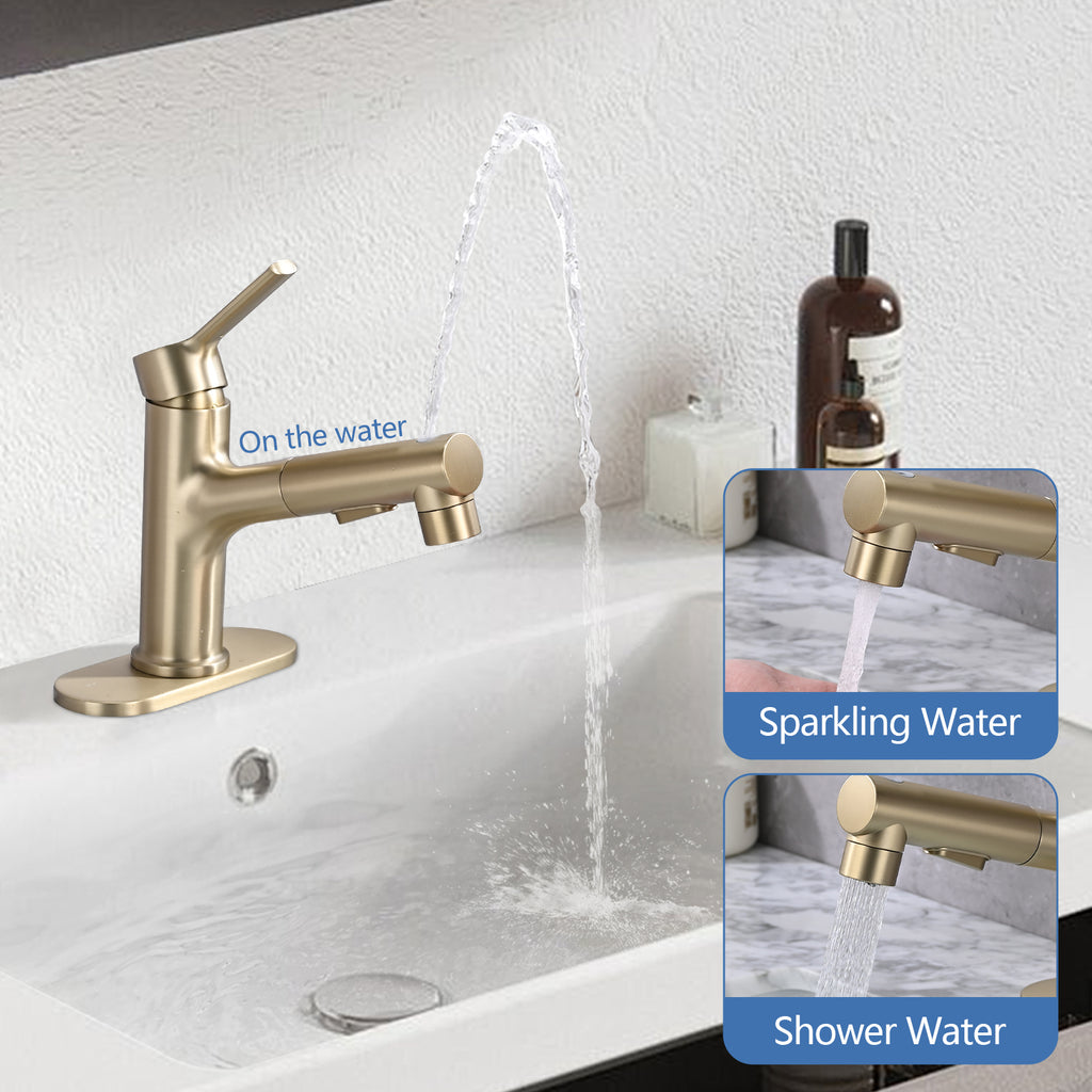 - 3 Function Spray Settings: (Bubbles/ Sprinkles/ Mouthwash). This bathroom sink tap perfectly combines an elegant Pull-out and 360° swivel design with exceptional ergonomics. The appearance is simple and generous, which will add elegance to your bathroom and kitchen.