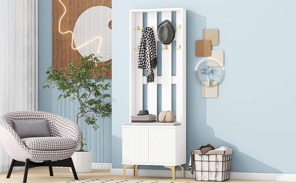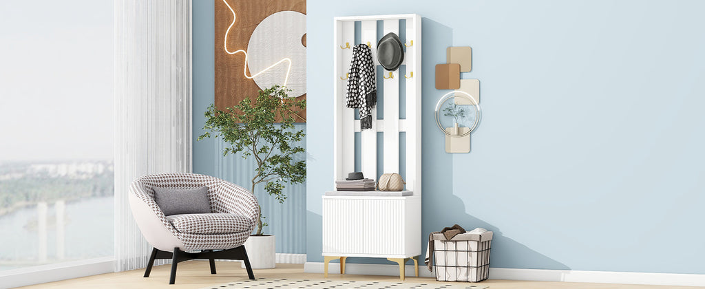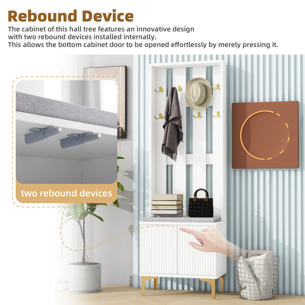 - This hall tree features beautifully fluted textured doors, transforming it into an attractive storage solution. The eye-catching golden hooks and legs not only add a touch of luxury but also bring a sense of delicacy to the piece. Whether you have a modern or classic home decor, this hall tree will enhance the look and feel of your living space.