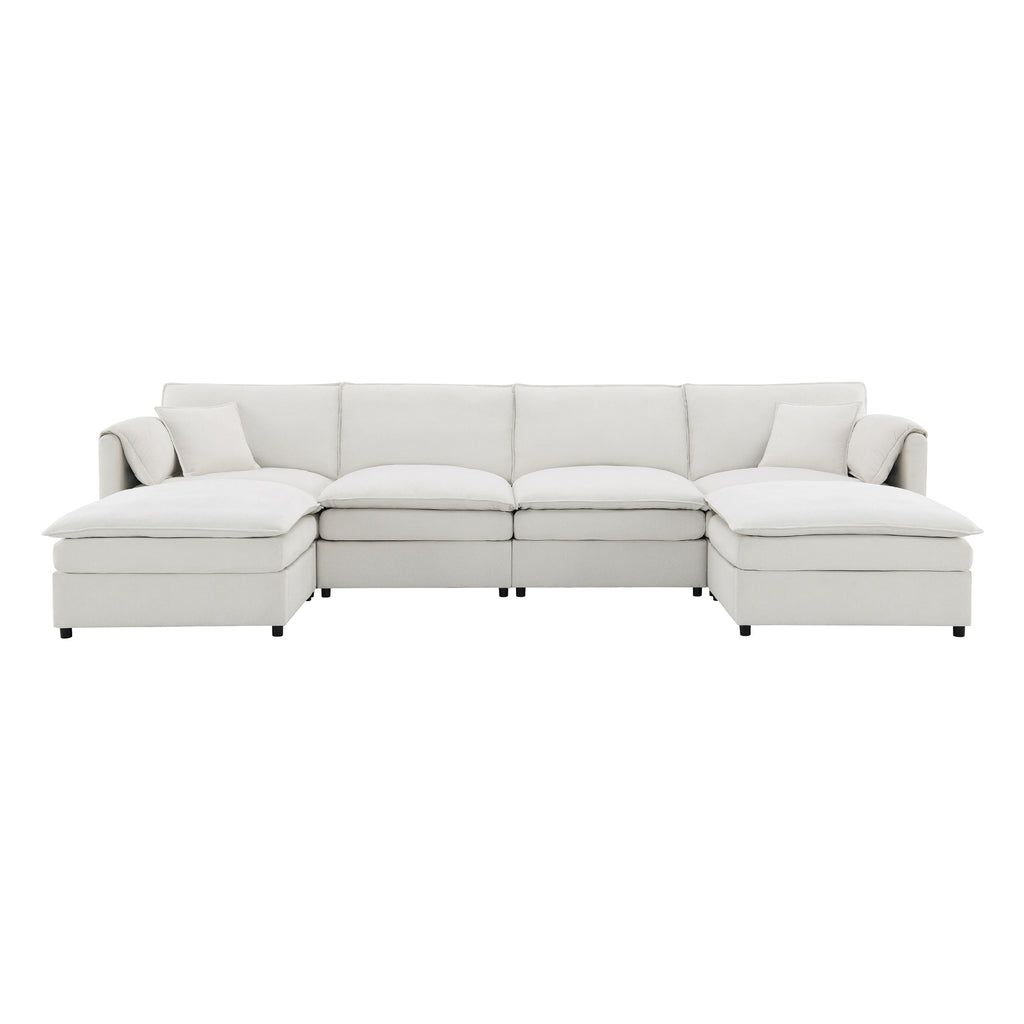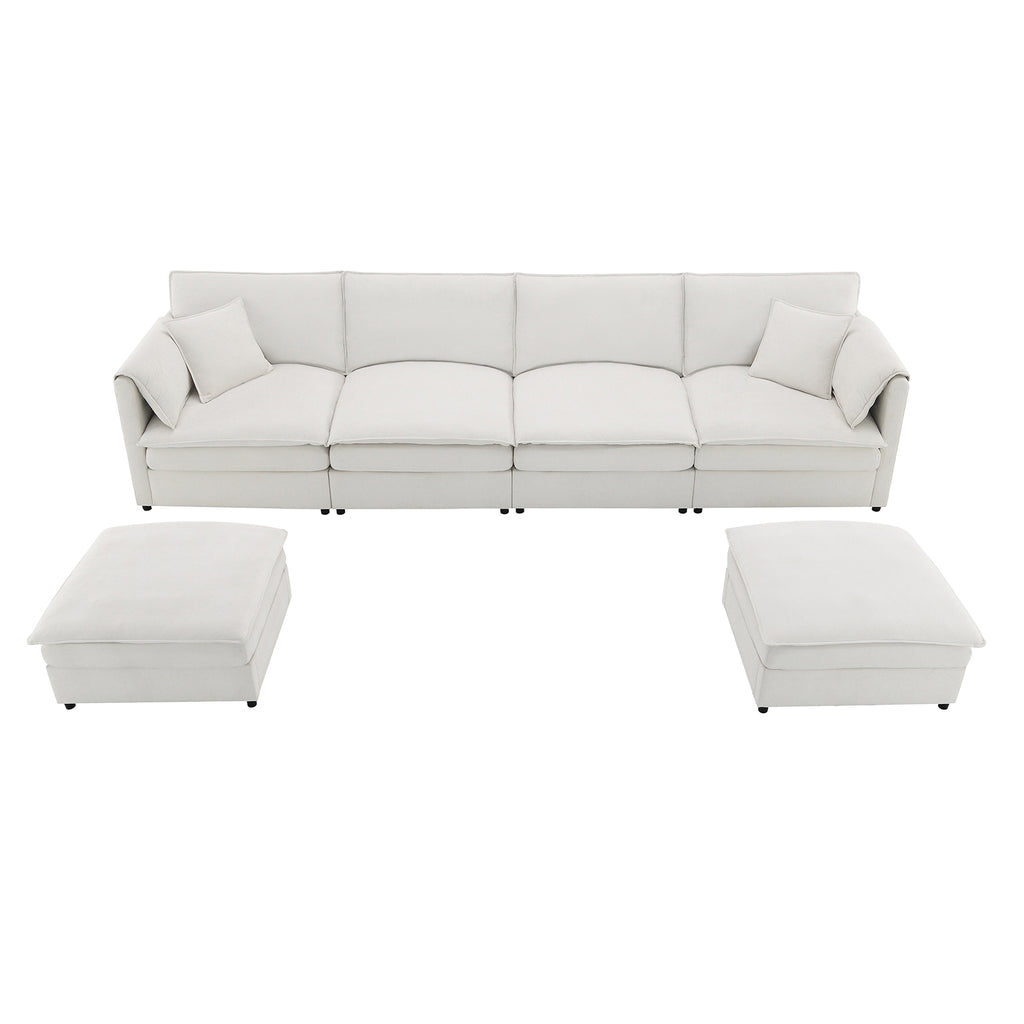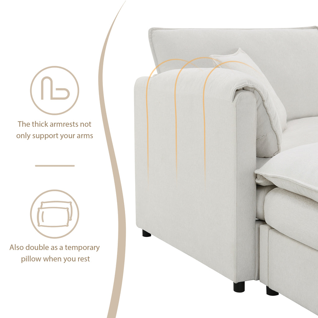 The sofa with double cushions, extra-wide seating, two removable ottomans, and armrest pillows on both sides offers the benefits of enhanced comfort, ample seating space, versatility, and convenient relaxation. Additionally, it boasts a stylish design that complements any interior decor.