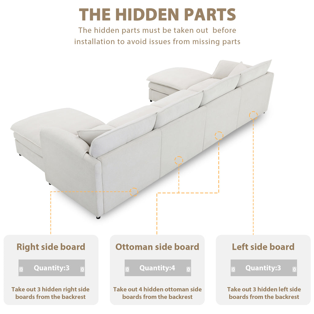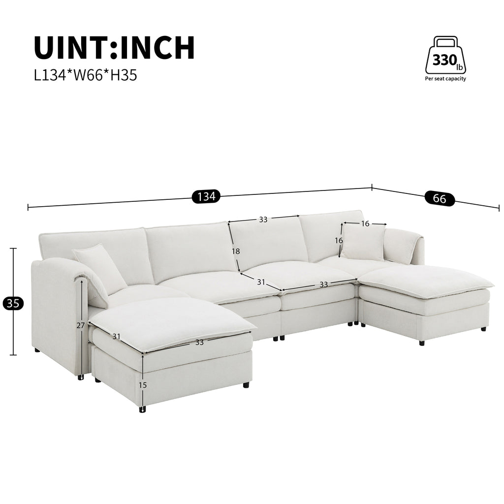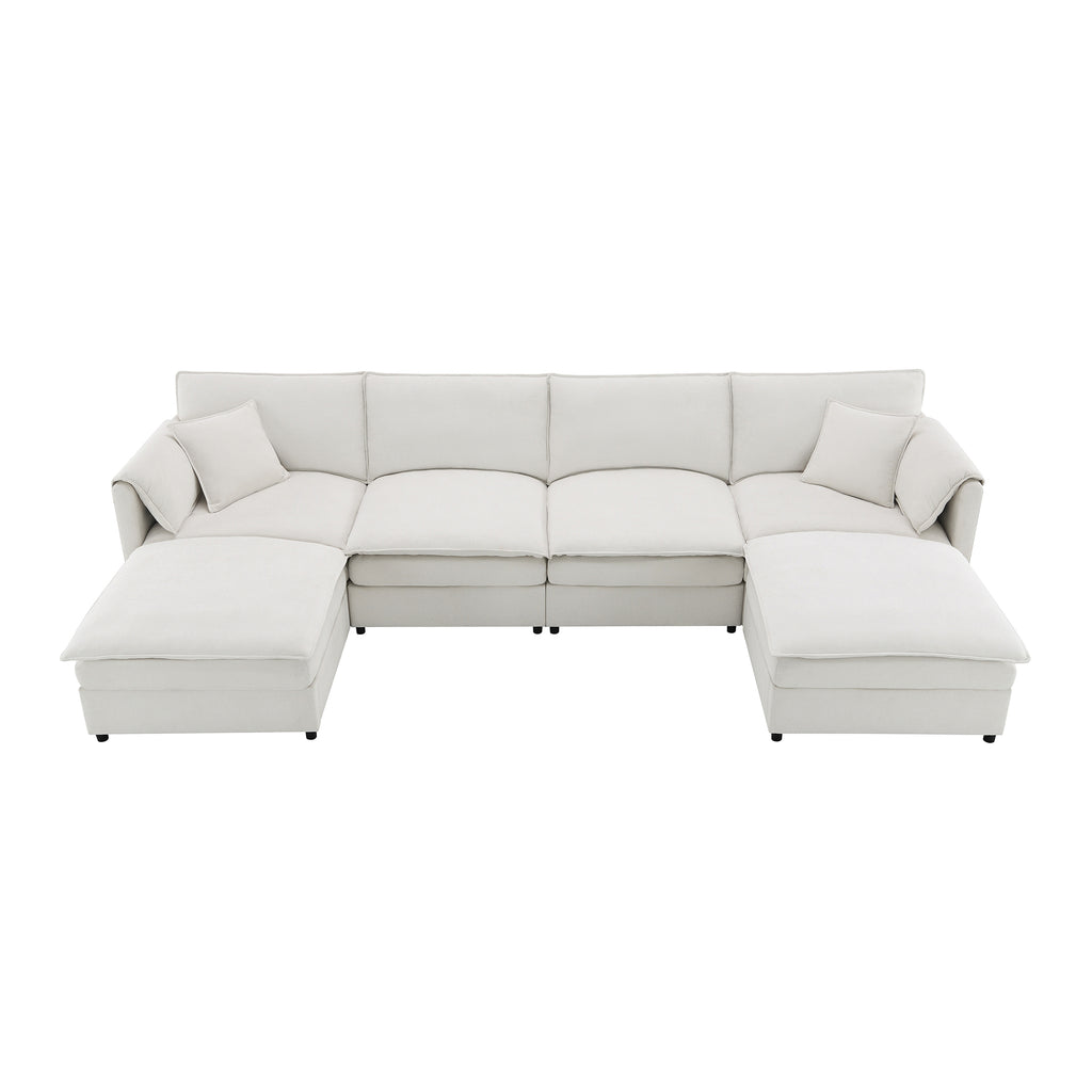 The sofa with double cushions, extra-wide seating, two removable ottomans, and armrest pillows on both sides offers the benefits of enhanced comfort, ample seating space, versatility, and convenient relaxation. Additionally, it boasts a stylish design that complements any interior decor.