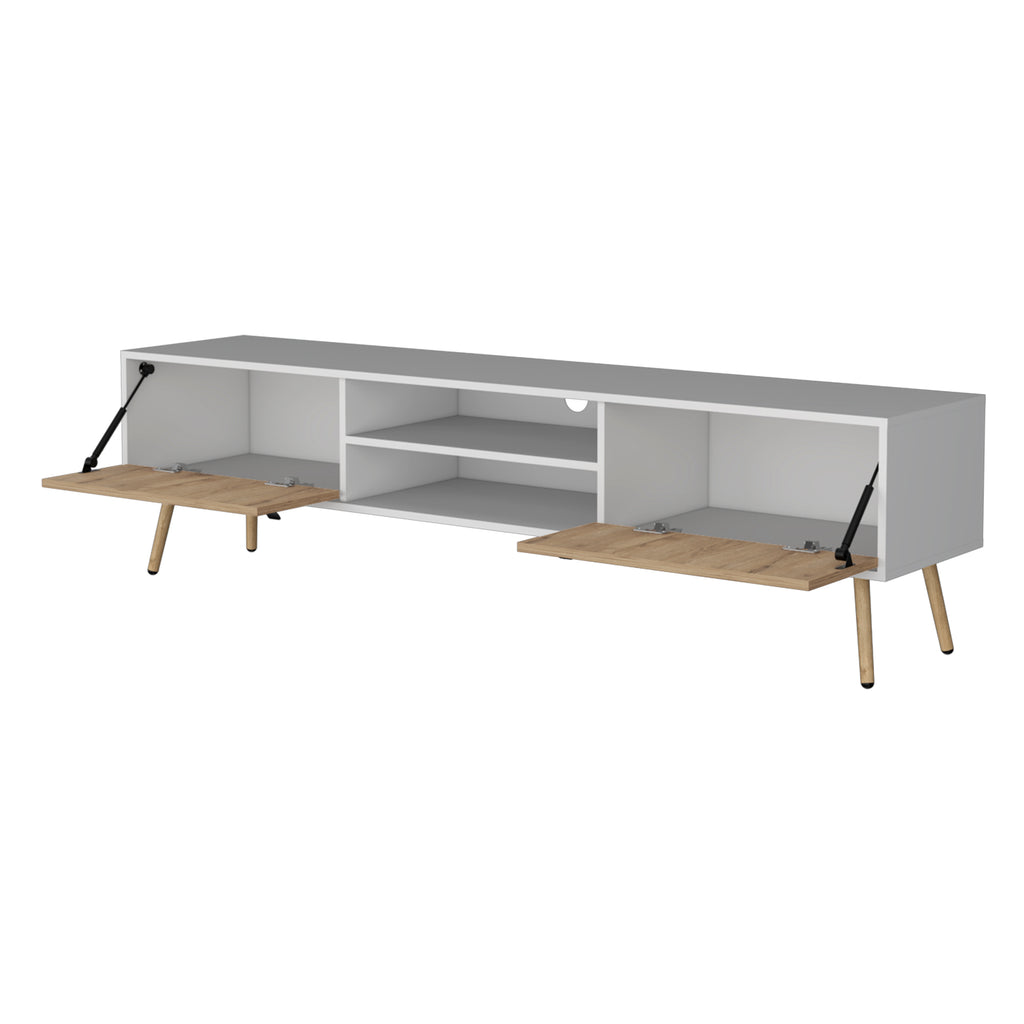 'In a chic white/macadamia manufactured wood finish, the Kimball TV Rack offers a stylish solution for your media needs. It features 2 hinged drawers (22.4''W x 9.8''H) for storage and 2 open shelves for consoles, all within a compact shelf (70.9''W x 15.3''D). Its design includes cable management and stands on sturdy wooden legs, blending functionality with modern aesthetics. Dimensions: Height: 18,8'' Width: 70,9” Depth: 15,3‘ Furniture Type: Ready to assemble (full assembly required). Certifications: CARB phase II compliant – TSCA Title VI Compliant.