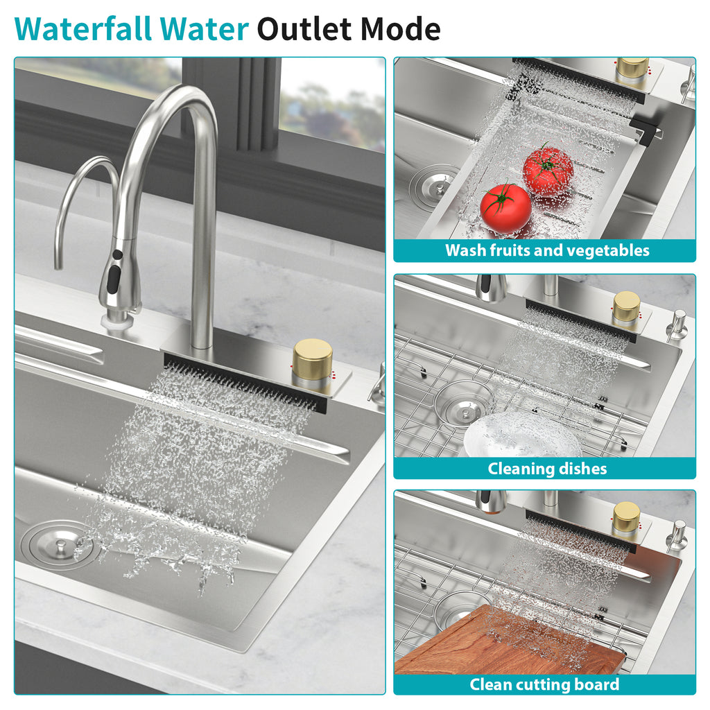 - [Unique Waterfall Design] The Unique Waterfall Kitchen Sink offers an elegant fusion of functionality and design. Boasting 3 water modes - cup wash, waterfall, and faucet. The pull-out faucet offers 3 flow modes, emphasizing a waterfall style. This innovative design elevates kitchen style, minimizing splashes and water waste.