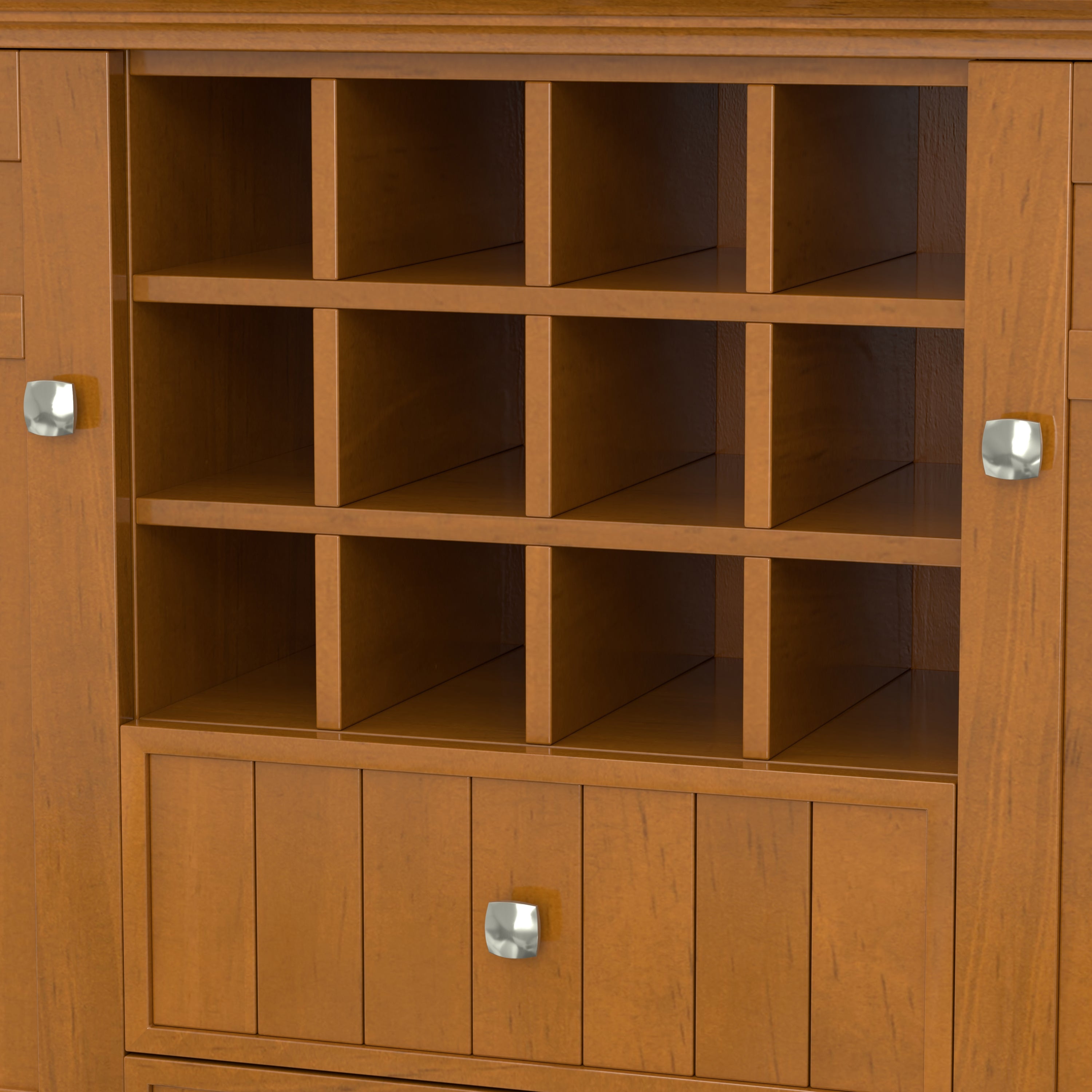 - Features two (2) central drawers with metal glides, two (2) side doors that open to large storage spaces with two (2) shelves each and a twelve (12) bottle wine storage rack.
