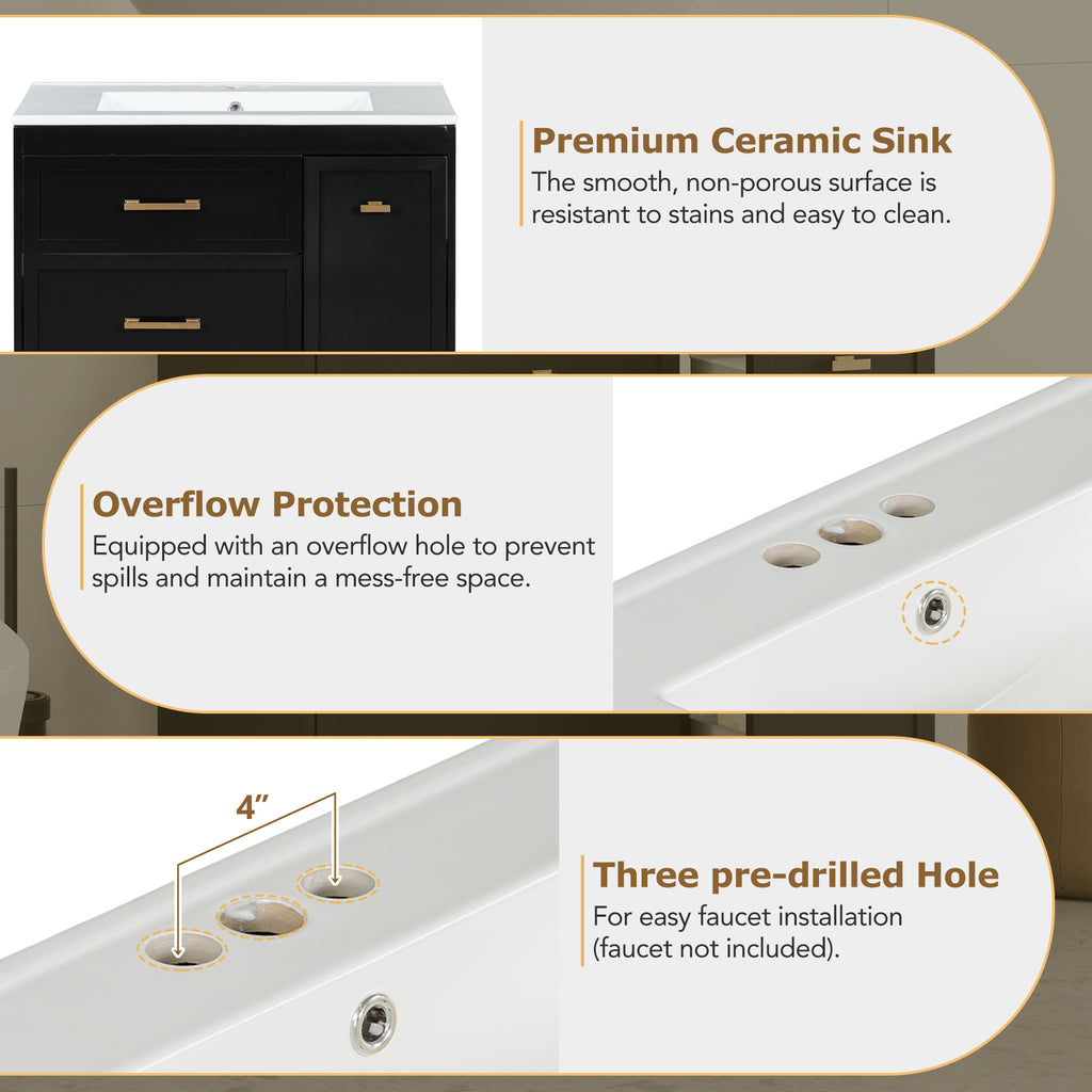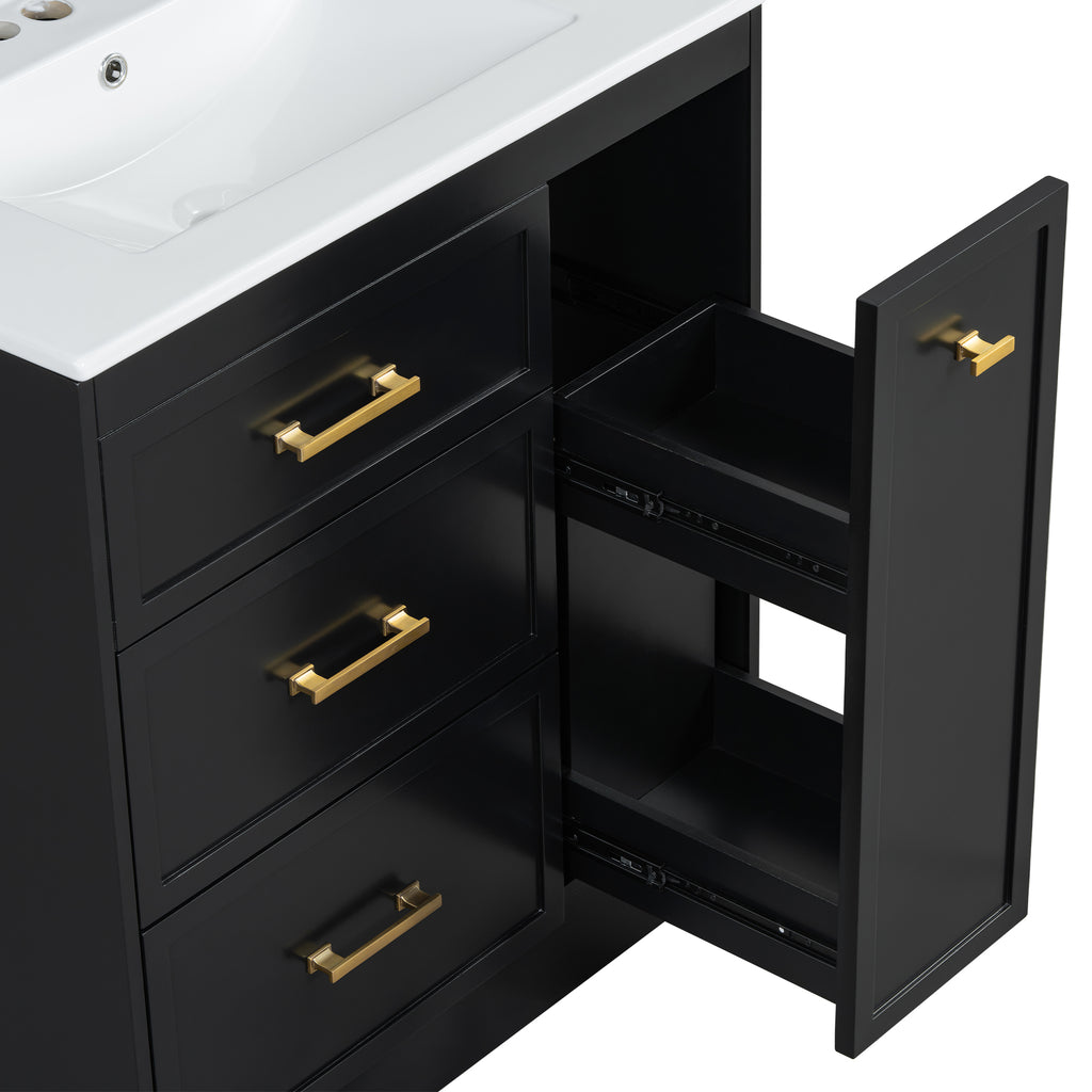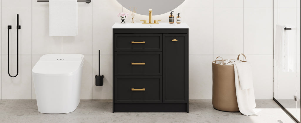 Transform your bathroom into a serene retreat with this 30' wide vanity, designed to elevate both space and style in smaller bathrooms. Its black elegance and golden accents add a timeless sophistication, while the ceramic basin with overflow promises effortless maintenance and a clean, dry space. Every inch is crafted for functionality: a double-layer drawer and deep compartments offer ample storage, keeping essentials organized and within reach. Built with durable MDF, this piece embodies enduring quality, blending beauty and utility seamlessly. Envision the harmony—where form meets function in your personal sanctuary.