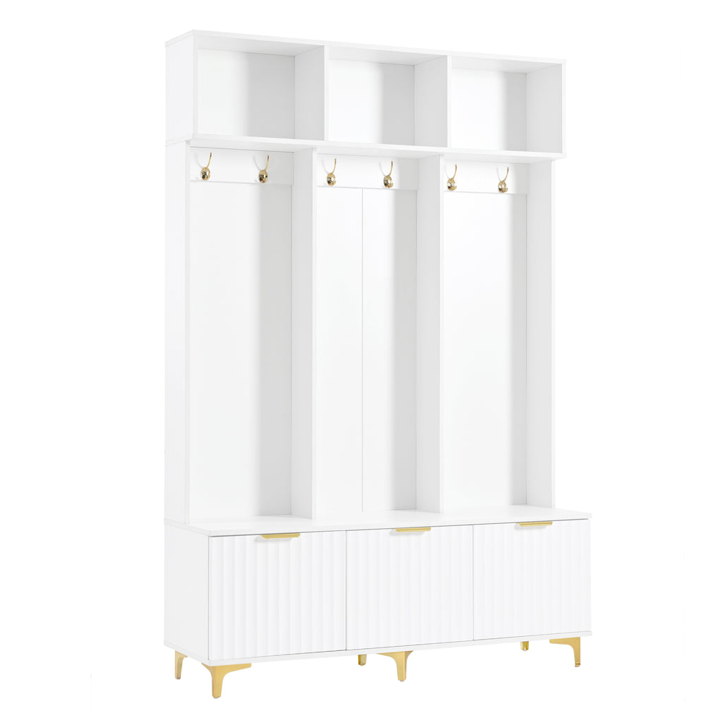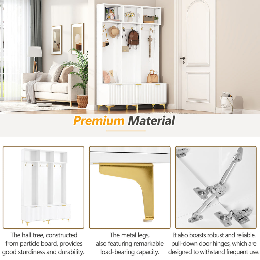 - This hall tree is a bright and glamorous storage cabinet with high gloss fluted textured doors, paired with shiny golden hooks, handles and legs. Its modern and elegant appearance design will enhance the decorative style of any living space.