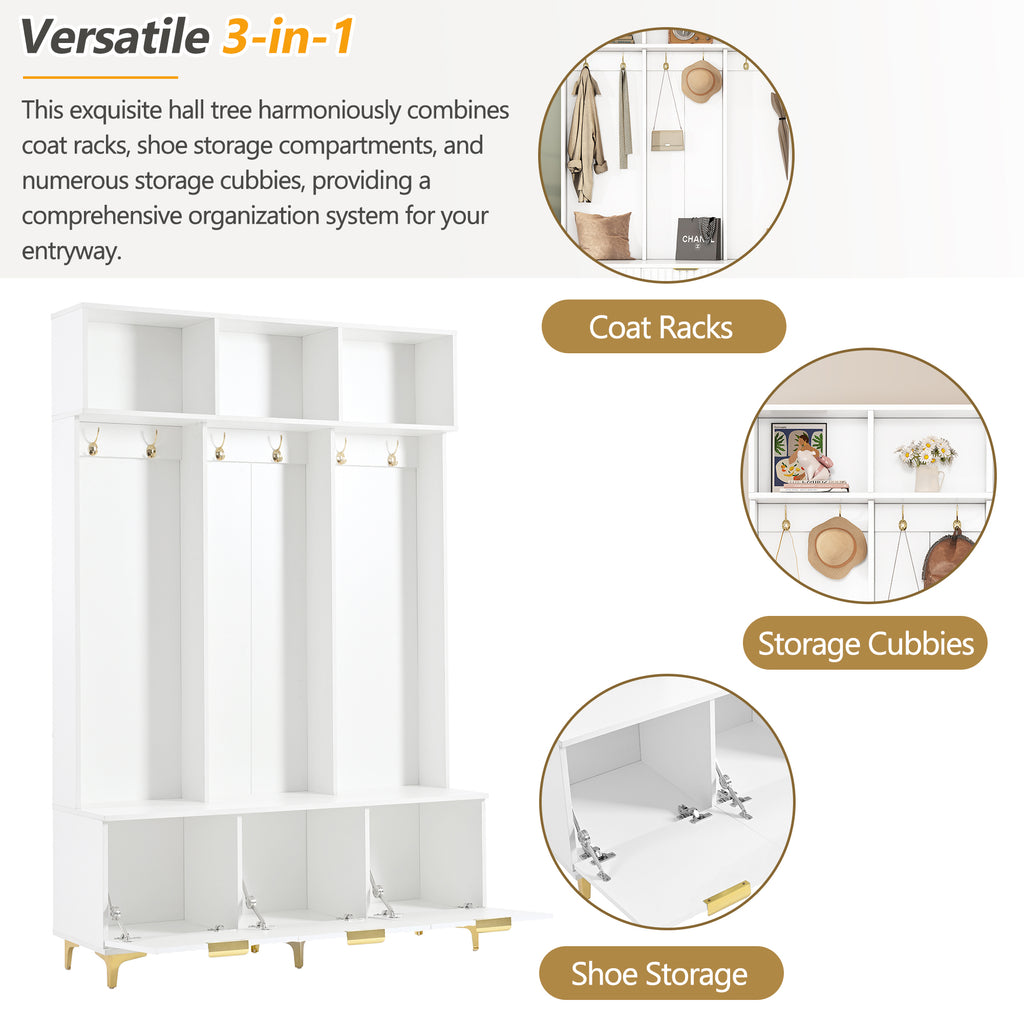 - This exquisite hall tree harmoniously combines coat racks, shoe storage compartments, and numerous storage cubbies, providing a comprehensive organization system for your entryway. Through this versatile cabinet, you can cater to different storage requirements without needing to acquire other storage furniture.