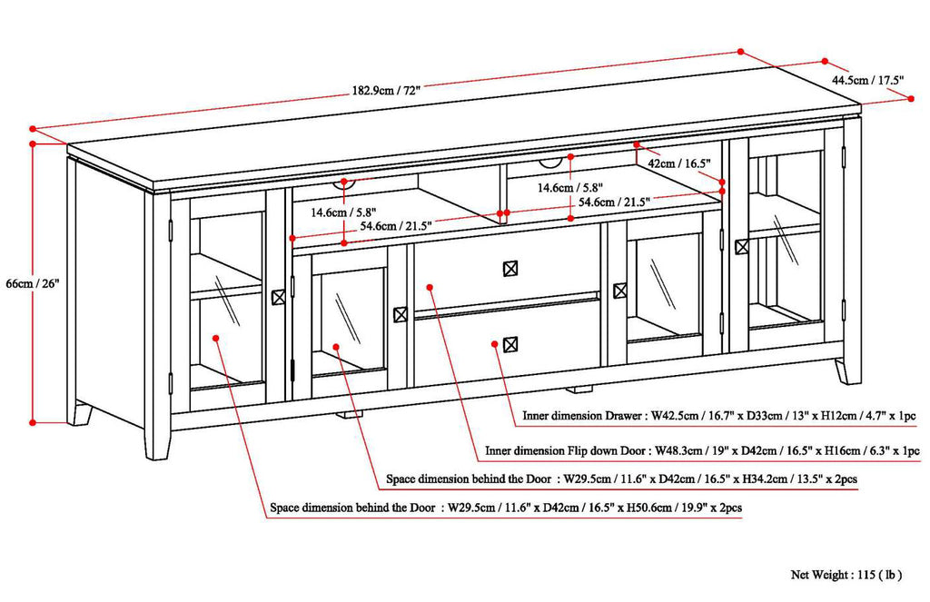 - Features a large centrally located open area with one (1) flip down drawer, one (1) pull out drawer as well as four (4) storage spaces with tempered glass doors