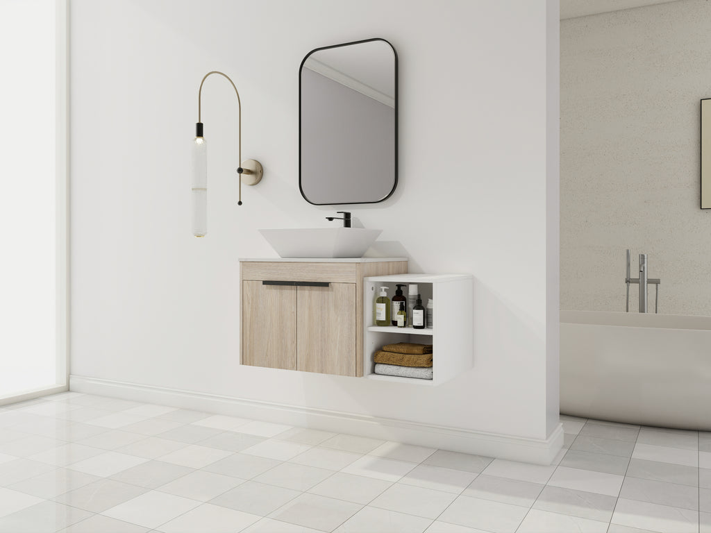 - With its timeless design, this vanity offers a peaceful and tranquil start to each day with its soft-close door and sleek, floating design.