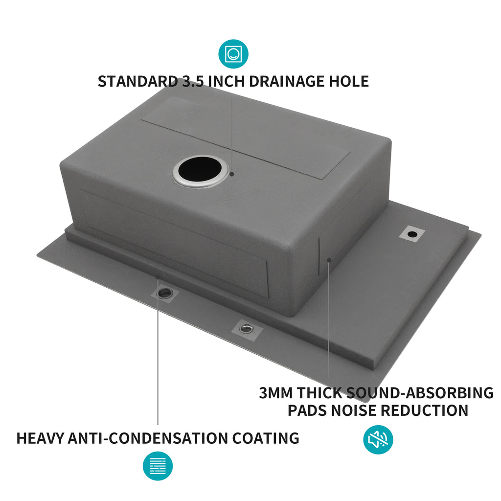 - [Coating and Silencer Pad] There is a thick coating on the outside of the sink to prevent condensation caused by weather changes. In addition, the 3mm thick rubber silencer pad can greatly reduce the noise from the faucet and give you a quieter cooking environment.
