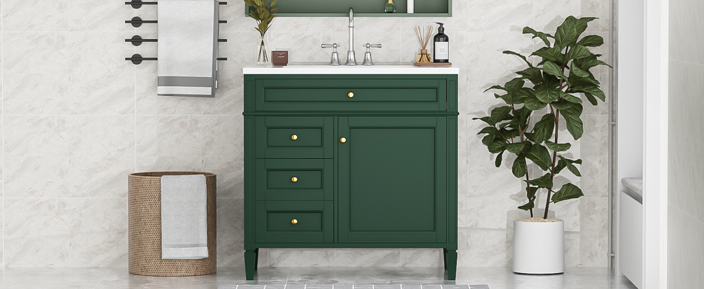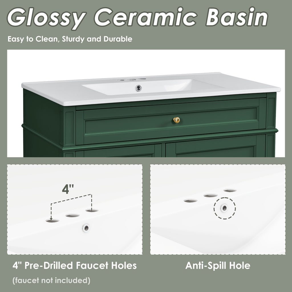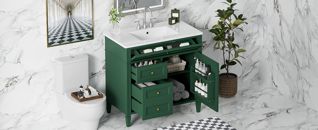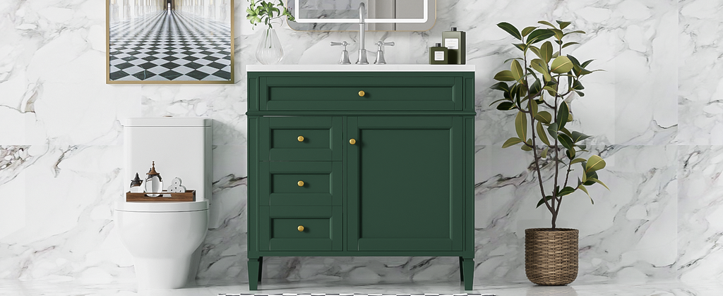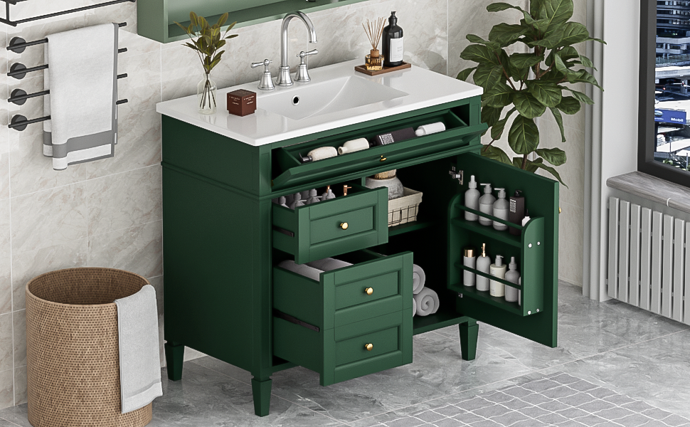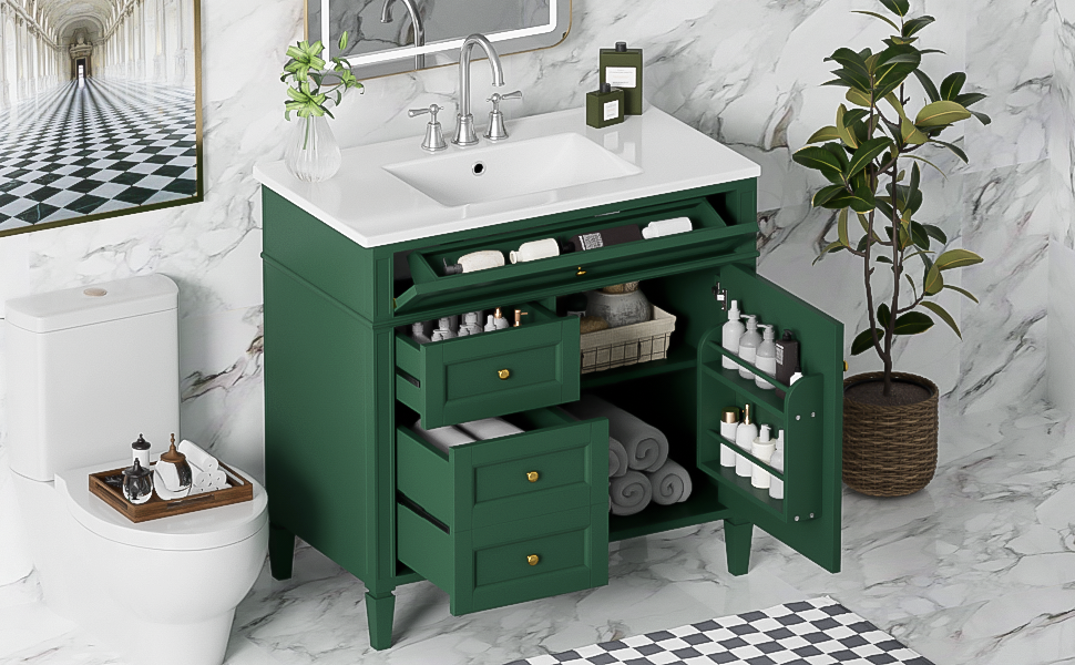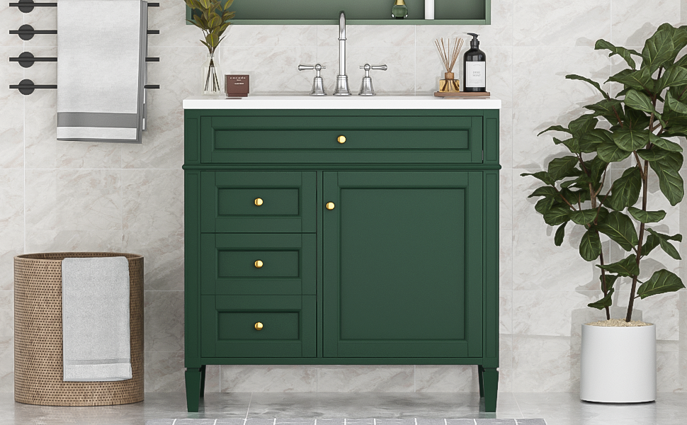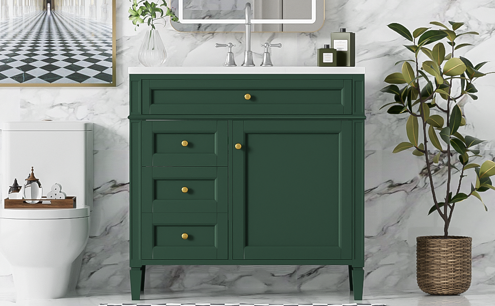 - [ Multi-Purpose Cabinet & Concealed Storage ] Are you looking for stylish and functional storage solutions for your bathroom? Our bathroom vanity provide ample space for all your toiletries and bathroom essentials. The combination of the cabinet body and the drawer perfectly stores all kinds of bathroom products and keeps the necessities away from water stains and dust. Soft-close doors and drawer fronts feature a water-resistant paint finish for durability.