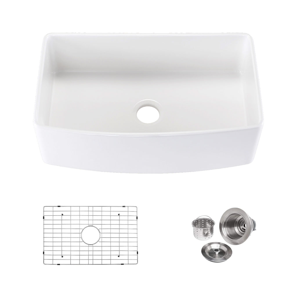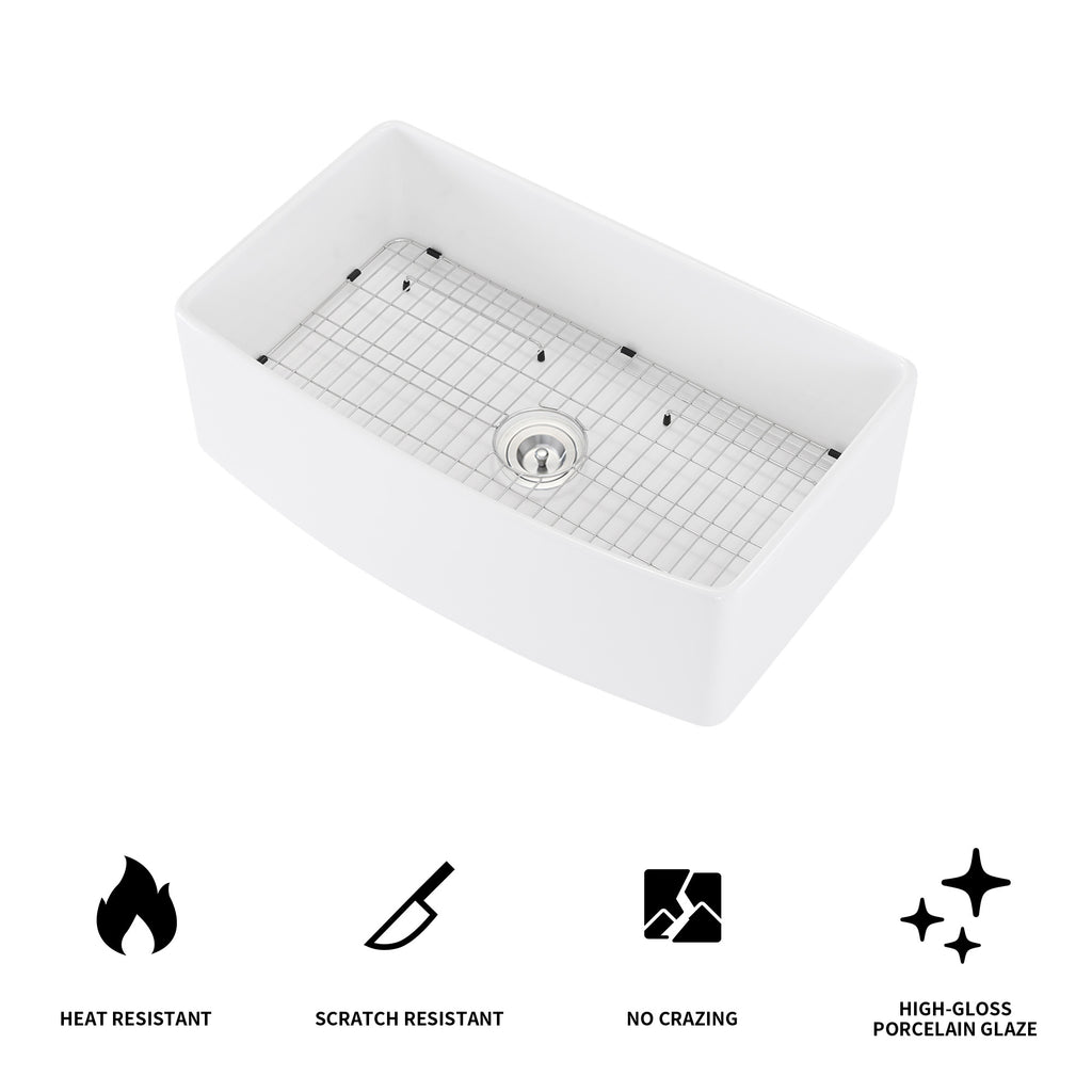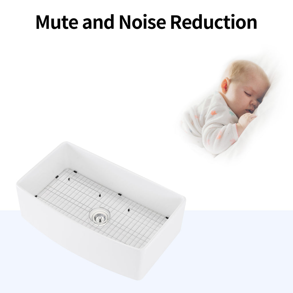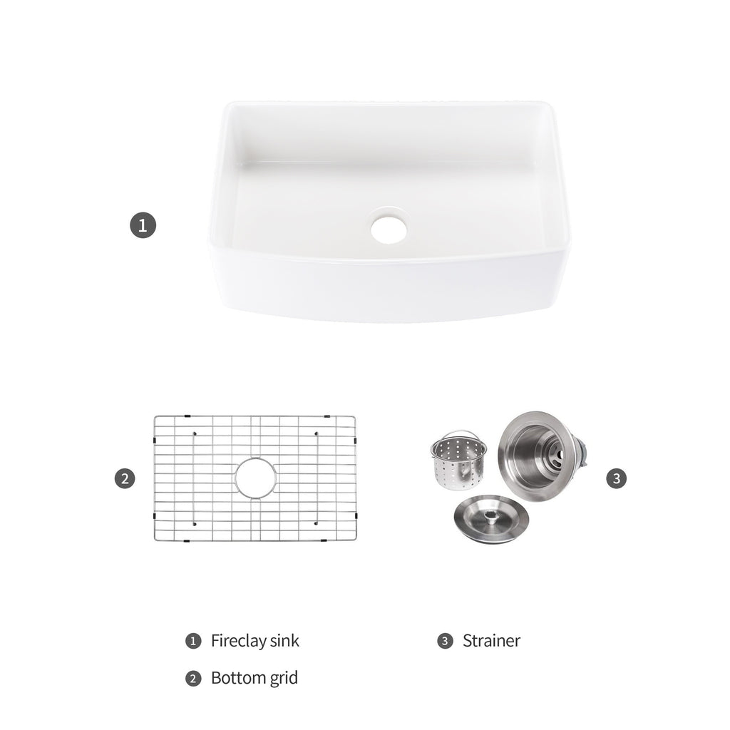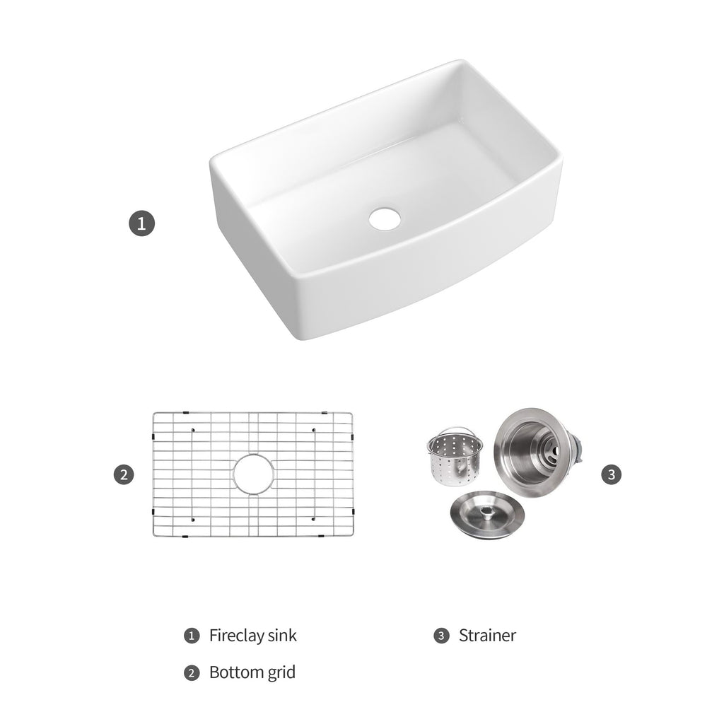 - Fireclay: The farmhouse sink is made of fireclay to ensure maximum durability and density, fired in a kiln over 2200℉ for about 24 hours. 3.5' drain opening fits most of the garbage units in the market.