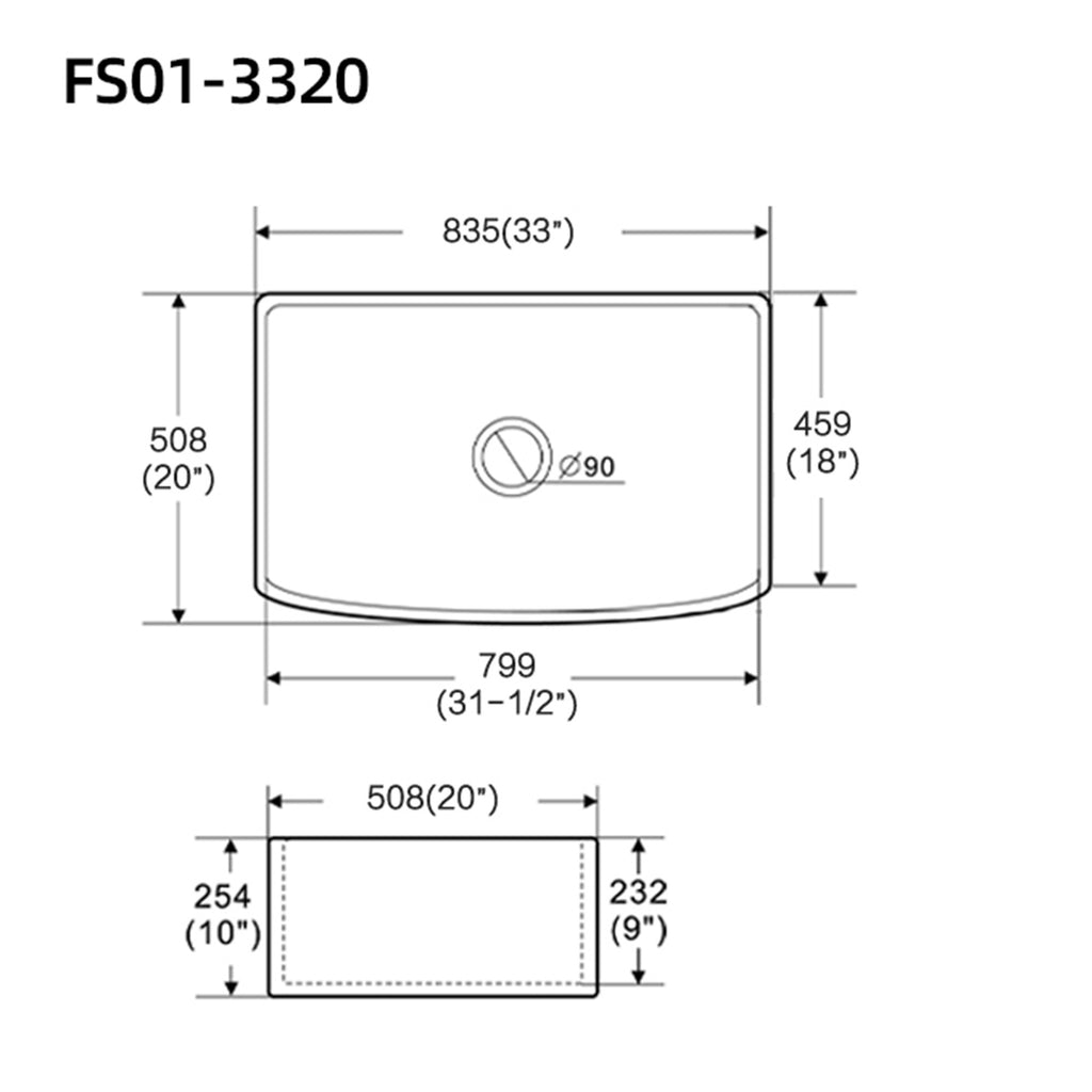 - This farmhouse apron kitchen sink is made of fireclay that has been calcined at high temperatures, making it solid and dense. Dimension: 33'W x 20'Dx 10'H. Minimum Cabinet Size: 33'.Capacity: The ultra-deep single basin provides ample depth, while the large basin makes it easy to fit pots, pans, and more.Easy to clean