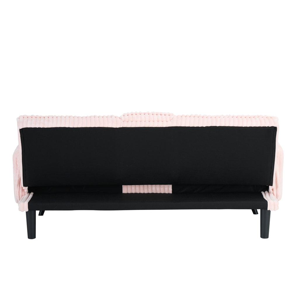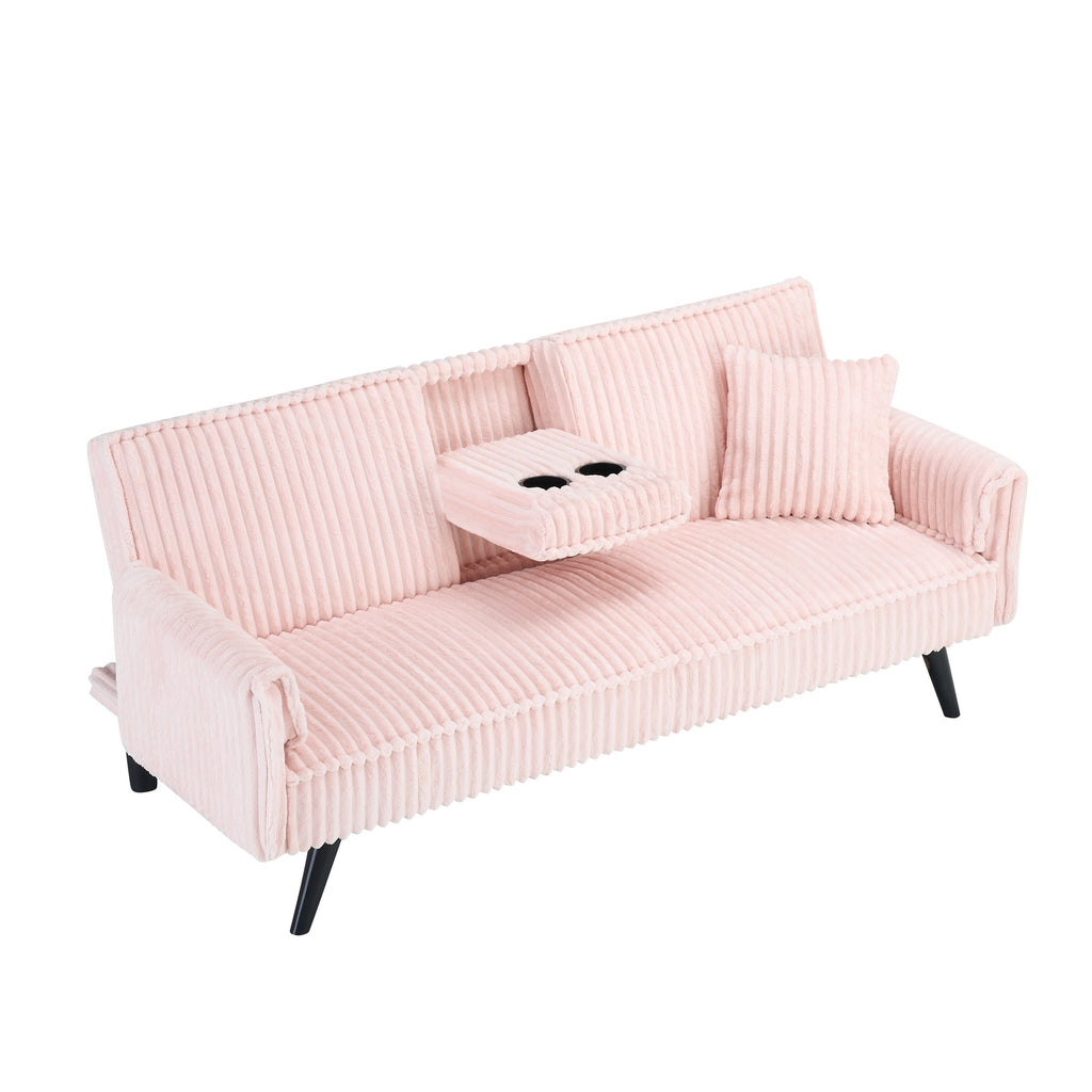 The pink sofa is like the first dawn of the sky, gently dyed with a pure and bright hue. The corduroy fabric it a unique texture, smooth and soft to the touch. Two cleverly embedded teacup holders in the middle of the sofa back can be easily operated for hosting of friends. The backrest can be adjusted to three different angles: the first angle allows for a slight recline, providing relief for the spine; the angle offers a deeper recline, allowing the back to sink in; the third angle transforms the sofa into a soft bed with a simple push, perfect for lying and relaxing when tired. The sofa is made with selected high-quality solid wood and plywood, providing a sturdy 'skeleton' with excellent load-bearing capacity. Choosing sofa is not just about adding a piece of furniture, but also bringing comfort, convenience, and quality of life into your home.