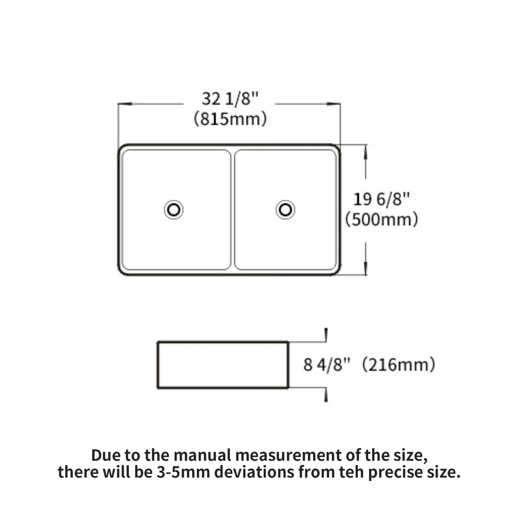 - Double Bowl Kitchen Sink Size and Accessories: 32*20*9 inch(minimum cabinet size is 35 inch), comes with a 32-inch farmhouse sink double bowl, 2 x 304 stainless steel dish grid, 2 x basket strainer.