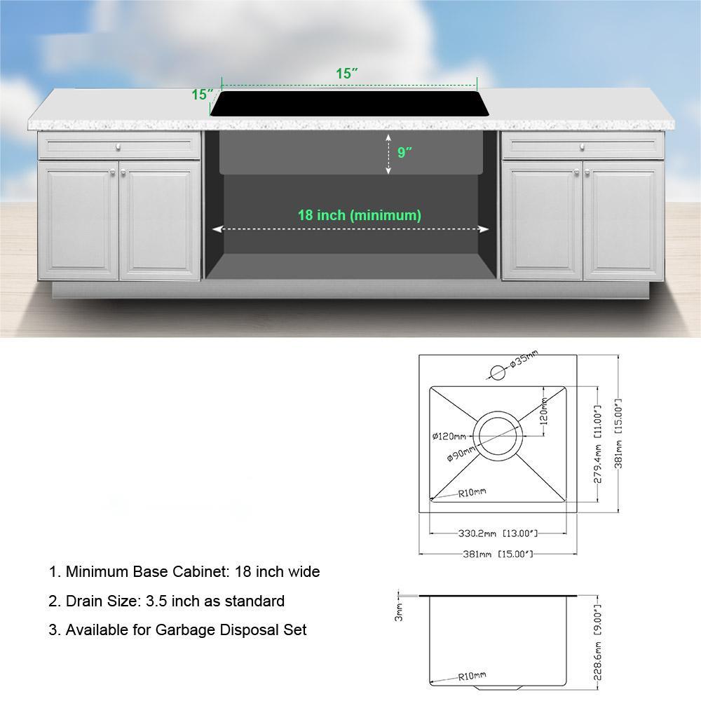 - [Dimensions] Sink Size:15 x 15 x 9 inch , Minimum cabinet size is 18 inch.Standard 3.5' drain openings will fit any garbage disposal unit.